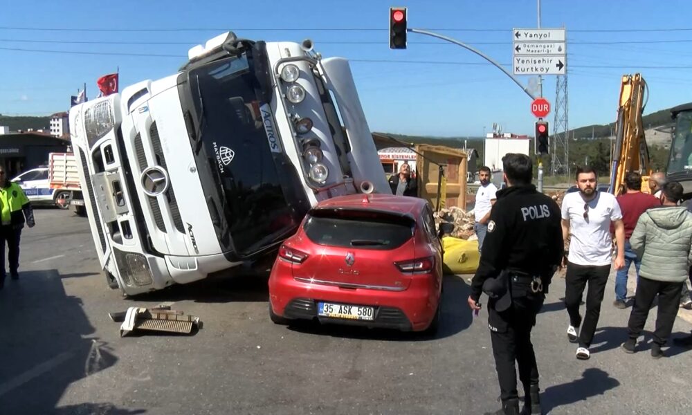İstanbul – Sultanbeyli’de hafriyat kamyonu otomobilin üzerinde devrildi; o anlar kamerada