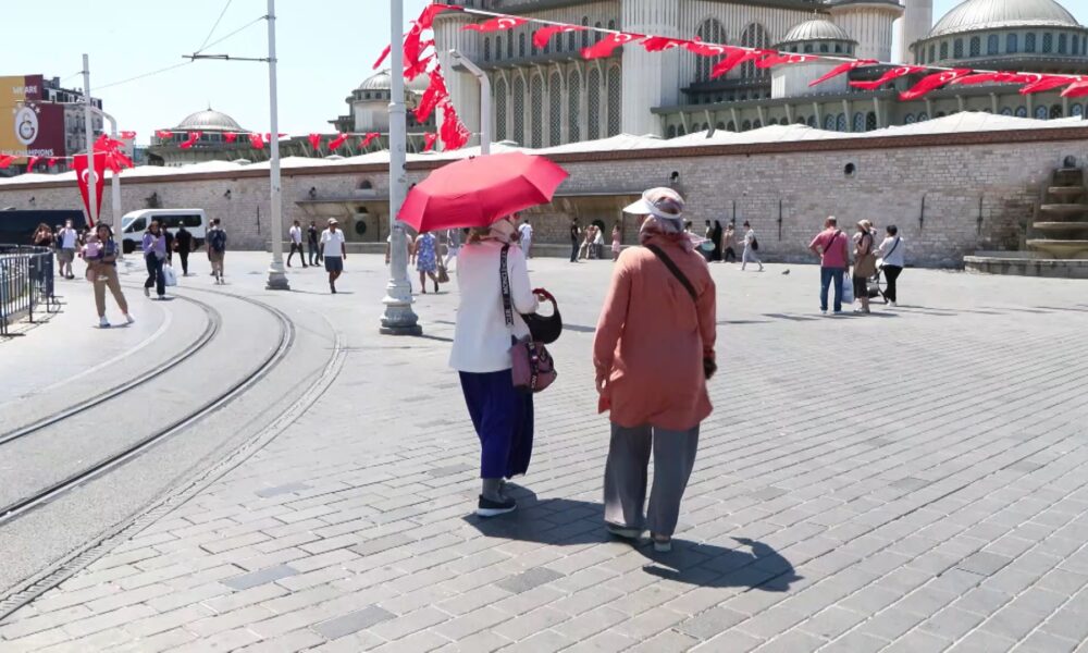 İstanbul – Taksim’de sıcak hava bunalttı; kimisi şemsiye ile gezdi, kimisi gölgede dinlendi