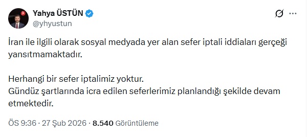 THY İletişim Başkanı Yahya Üstün, sana medya hesabından yaptığı paylaşımda, “İran ile ilgili olarak sosyal medyada yer alan sefer iptali iddiaları gerçeği yansıtmamaktadır. Herhangi bir sefer iptalimiz yoktur. Gündüz şartlarında icra edilen seferlerimiz planlandığı şekilde devam etmektedirö ifadelerini kullandı.
