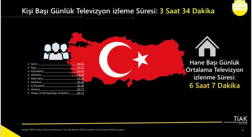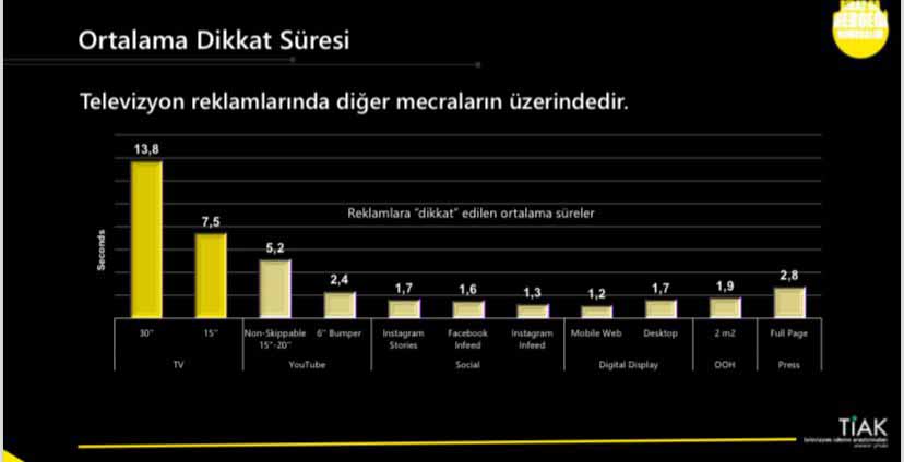 Sunumda; televizyonun dünyada günde ortalama 2 saat 19 dakika izlendiği belirtilirken. Türkiye’de kişi başı televizyon izleme süresinin ise 3 saat 34 dakika olduğu aktarıldı. Türkiye’de hane başı günlük ortalama televizyon izlenme süresi ise 6 saat 7 dakika olarak ifade edildi. Televizyonun erişim gücünün anlatıldığı panelde televizyon yayınlarının en çok izlendiği zaman diliminin (prime time) 20:00 ve 23:00 saatleri olduğu belirtildi. Ortalama erişim ise 27 milyon 789 bin kişi olarak belirtildi.