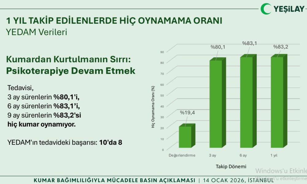 İnternet ve cep telefonlarının kumara erişimde rol oynadığını vurgulayan ve YEDAM’daki tedavi başarı oranlarından bahseden Dinç, “Kumara bulaşma anlamında internet çok önemli, cep telefonları çok önemli bir aracılık rolü oynuyor. Yeşilay Danışmanlık Merkezlerimizde, 105 tane noktada, Türkiye’nin her şehrinde ücretsiz bir şekilde hizmet veren merkezlerimizde, 3 ay tedaviye gelen danışanlarımızın yüzde 80’ini, 6 ay gelenlerin yüzde 83’ünü, 9 ay gelenlerin yüzde 83’ünü kurtarmış durumdayız. Yani bir insan bağımlı olduğunda Yeşilay Danışmanlık Merkezlerine gelir ve devam ederse 10 kişiden 8’ini kurtarmış oluyoruz. Bu çok büyük bir rakam. Bu çok ümit verici, heyecan arttırıcı bir rakam çünkü bağımlılıklar, diğer bütün psikopatolojilere kıyasla tedaviye çok daha dirençlidirler. Ve kumar bağımlılığı diğer bağımlılıklardan da daha da dirençlidir. Dolayısıyla kumar bağımlısı bir kardeşimizi devam etmesi halinde bu kadar istikrarlı bir şekilde, bu kadar yoğun ve üst düzeyde bir şekilde kurtarabiliyorsak bu işin mücadelesi mümkün, bu işin önüne geçmek mümkün. Bir çağrıda bulunmak istiyorum. Kumara bir şekilde bulaştıysak çaresi var.” diye konuştu