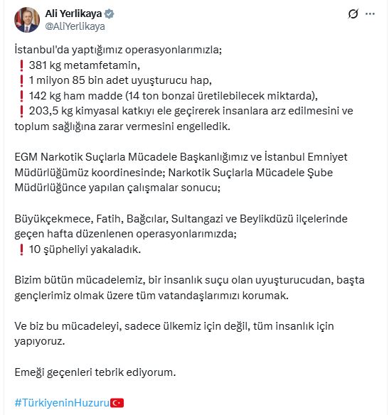 İçişleri Bakanı Ali Yerlikayanın, sosyal medya hesabından yaptığı açıklamaya göre; Büyükçekmece, Fatih, Bağcılar, Sultangazi ve Beylikdüzü ilçelerinde düzenlenen operasyonlarda 10 şüpheli yakalandı. Operasyonlarda 381 kilogram metamfetamin, 1 milyon 85 bin uyuşturucu hap, 142 kilogram ham madde, 203,5 kilogram kimyasal ele geçirildi. Bakan Yerlikaya, “Bizim bütün mücadelemiz, bir insanlık suçu olan uyuşturucudan, başta gençlerimiz olmak üzere tüm vatandaşlarımızı korumak. Ve biz bu mücadeleyi, sadece ülkemiz için değil, tüm insanlık için yapıyoruz. Emeği geçenleri tebrik ediyorum” ifadelerini kullandı.