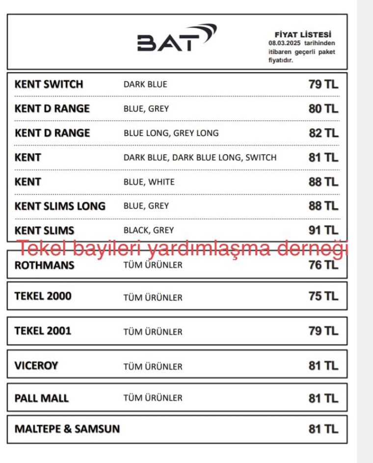 Tekel Bayileri Yardımlaşma Derneği Başkanı Erol Dündar, sosyal medya hesabından yaptığı açıklamada British American Tobacco (BAT) sigara grubuna zam yapıldığını duyurdu.