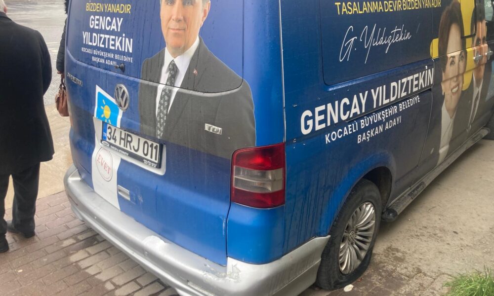 İYİ Parti Kocaeli Büyükşehir Belediye başkan adayı Gencay Yıldıztekinin seçim minibüsünün lastiklerini kesen 2 kişi, polis tarafından yakalanıp, gözaltına alındı.İYİ Parti Kocaeli Büyükşehir Belediye başkan adayı Gencay Yıldıztekine ait fotoğraf, slogan ve parti logolarının bulunduğu seçim minibüsünün lastikleri, önceki gece Gebze ilçesi Osman Yılmaz Mahallesi İstasyon Caddesi’nde park halindeyken kesildi. Kendisine ait iş yeri önünde yaşanan olay sonrası Yıldıztekin, durumu polise bildirdi. Aracının lastiklerinin kesildiğini video paylaşarak duyuran Yıldıztekin, “Şehrin merkezinde, güvenlik kameralarının olduğu yerde, seçim aracımızın lastikleri düşmanca kesildi. Bu, bizim gözümüzde bir milli servettir. Nerede olursa olsun, kimin malı olursa olsun, yapılması hiç doğru değil. Kin ve nefret ile yapılan bu işlerin yarın başka sonuçlar doğurmamasını diliyorum” dedi.ŞÜPHELİLER GÜVENLİK KAMERASINDAAracın lastiklerini kesen şüpheliler, Yıldıztekine ait iş yerinin güvenlik kamerasına yansıdı. Görüntülerde, saat 03.50 sıralarında minibüsün yanına gelen 2 kişinin bir süre araç çevresinde dolaştıktan sonra ayrıldığı görüldü. Güvenlik kamerası görüntülerinden yola çıkan polis ekipleri, şüphelilerin İ.E.Ç. (19) ve Ü.S.N. (20) olduğunu belirledi. Ekipler, 2 şüpheliyi de gözaltına aldı. Şüphelilerden İ.E.Ç.nin ‘kasten yaralama’ suçundan kaydı olduğu öğrenildi. Şüpheliler, emniyetteki işlemlerinin ardından ‘Mala zarar verme’ suçlaması ile adliyeye sevk edilecek.