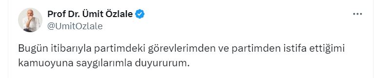 Ümit Özlale, sosyal medya hesabından yaptığı açıklamada, “Bugün itibarıyla partimdeki görevlerimden ve partimden istifa ettiğimi kamuoyuna saygılarımla duyururum” dedi.
