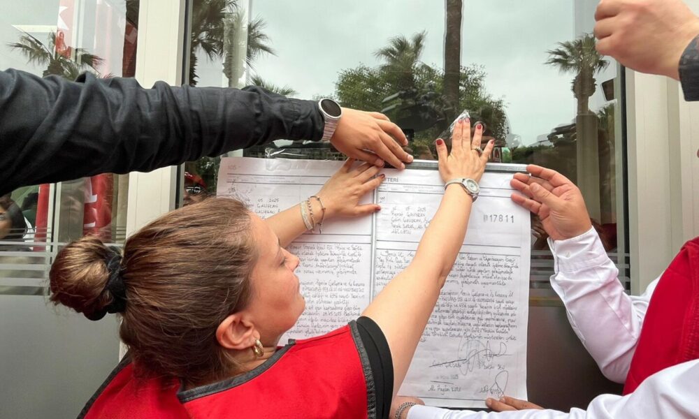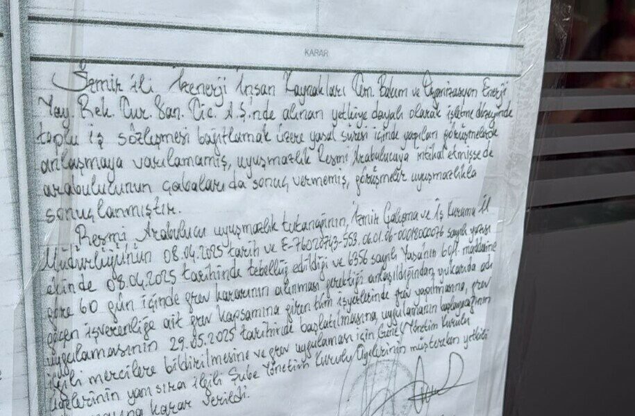 İzmir Büyükşehir Belediyesi şirketlerinden olan İZENERJİ, İZELMAN ve Ege Şehir Planlama işçileri, maaşlarının sadece 20 bin TL olarak yatırılması ve TİS görüşmelerinin tıkanması nedeniyle İzmir Büyükşehir Belediyesi Hizmet Binası’nda toplandı. İşçiler Kültürpark içerisindeki belediye binasına grev ilan kararını astı. DİSK/Genel-İş İzmir 1,2,3 ve 9 No’lu Şubeler adına konuşan 3 No’lu Şube Başkanı Serap Yılmaz, “Toplu İş Sözleşmesi görüşmelerinde taleplerimiz hayat bulmadığı takdirde grev pankartlarımızı belediye binalarına asarak 28 Mayıs 2025 tarihinde saat 00.00 itibarıyla grev uygulamasına başlayacağımızı kamuoyuna resmen duyuruyoruz” dedi.