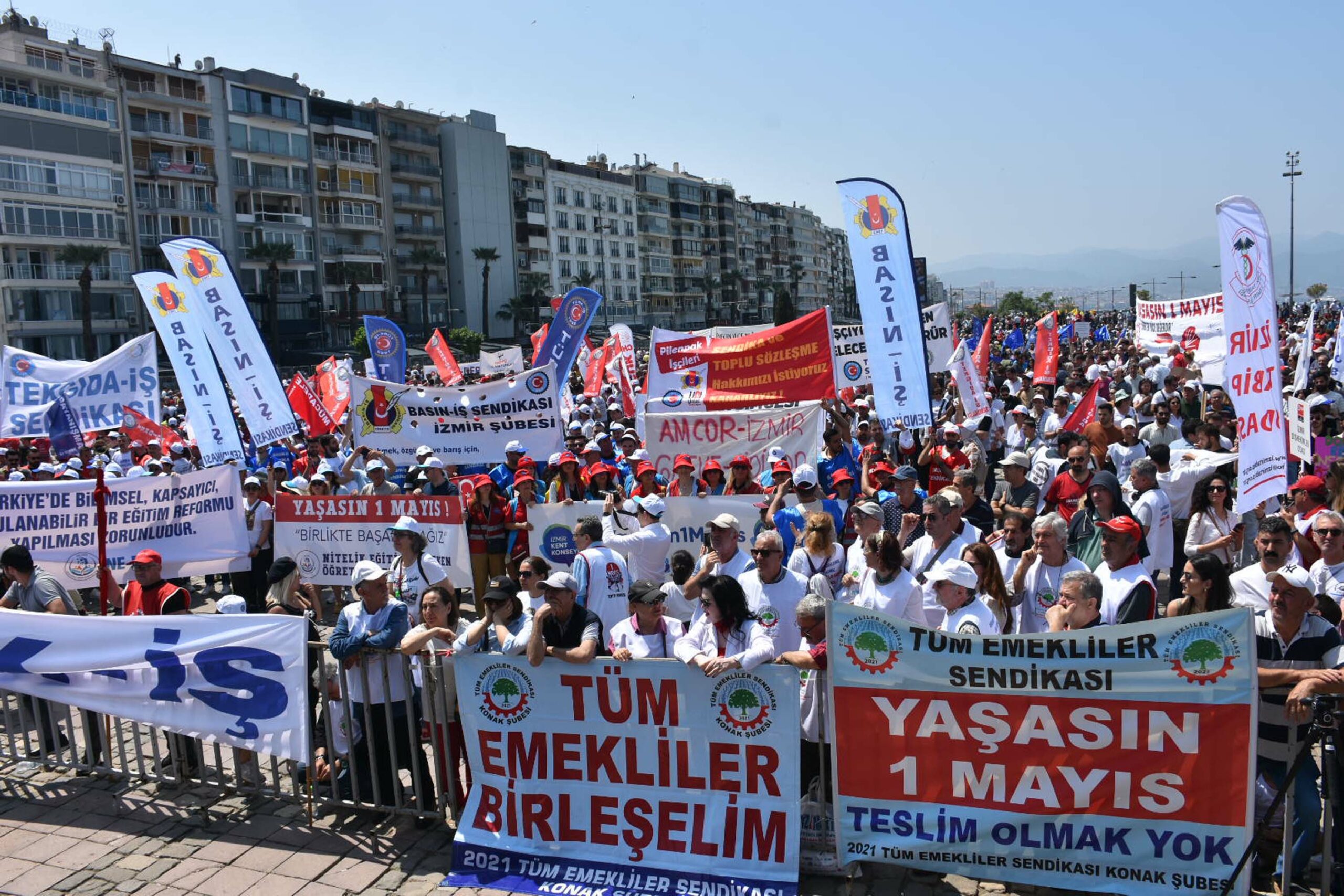 1 Mayıs Emek ve Dayanışma Günü, bu yıl da Alsancak Gündoğdu Meydanında kutlandı. Kutlama alanında geniş güvenlik önlemleri alındı. Gündoğdu Meydanında yapılan kutlamalar sebebiyle Alsancaka çıkan yolların bazıları ile meydanın çevresi demir bariyerlerle kapatıldı. Kutlamalarda İzmir İl Emniyet Müdürlüğü’ne bağlı 12 bin 500 personel görev yaptı. CHP İzmir İl Başkanlığı, Lozan Meydanı Kültürpark’tan kortej yürüyüşüyle Gündoğdu Meydanı’na ulaştı. Korteje İzmir Büyükşehir Belediye Başkanı Cemil Tugayın yanı sıra CHP İzmir milletvekilleri de katıldı. Kutlamalar kapsamında sendikalar, sivil toplum kuruluşları, meslek odaları, siyasi partiler ve vatandaşlar, kortejlerle alana geldi. Kutlama için alana gelenler, üst aramaları yapıldıktan sonra alana giriş yaptı.