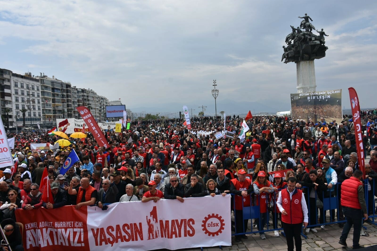 1 Mayıs Emek ve Dayanışma Günü, bu yıl da Alsancak Gündoğdu Meydanında kutlandı. Kutlama alanında geniş güvenlik önlemleri alındı. Kutlamalar kapsamında sendikalar, sivil toplum kuruluşları, meslek odaları, siyasi partiler ve vatandaşlar, kortejlerle alana geldi. CHP İzmir İl Başkanlığı Lozan Meydanından, DİSK Ege Bölge Temsilciliği Basmane Meydanından, Türk-İş Ege Bölge Temsilciliği Alsancak Limanından KESK ile çok sayıda sivil toplum kuruluşu Cumhuriyet Meydanından, TMMOB, İzmir Barosu ve İzmir Tabip Odası ise Kıbrıs Şehitleri Caddesinde buluşarak Gündoğdu Meydanına yürüdü. Meydana gelenler, üst aramaları yapıldıktan sonra alana giriş yaptı. Yürüyüş ve konuşmaların ardından alanı dolduranlar, halay çekti. 1 Mayıs kutlamaları, İlkay Akkaya konseri ile devam etti. Alandaki kutlamalar sürüyor.