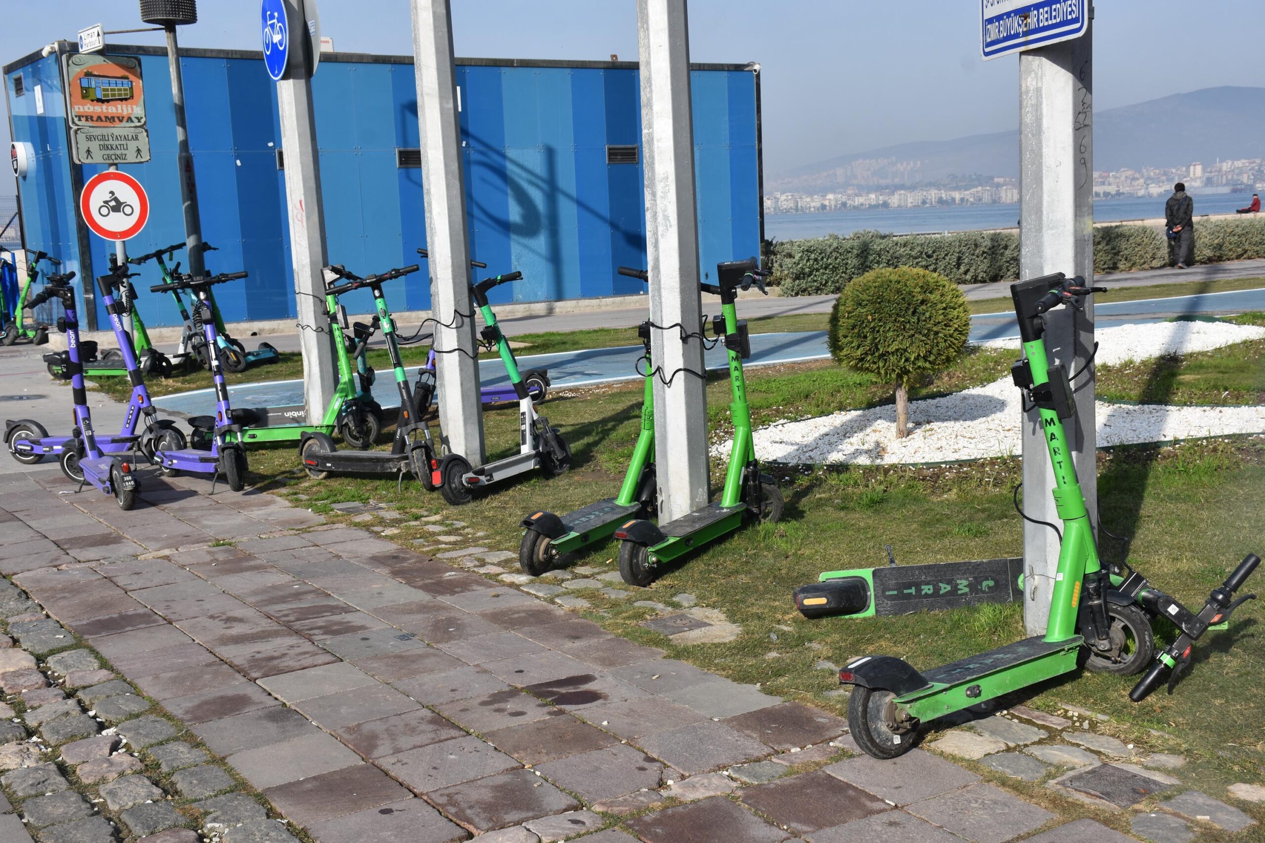 İzmir İl Emniyet Müdürlüğü’nden yapılan yazılı açıklamada, “Karayolları Trafik Kanunu’nda 24.12.2020 tarihinde yapılan düzenleme ile mevzuat kapsamına alınarak ülkemizde kullanımı yasal boyuta ulaşan ve ilimizde özellikle gençler tarafından oldukça tercih edilen elektrikli skuterlerinde diğer araçlar gibi kullanımı kurallara bağlanmıştır. Elektrikli skuter ya da e-skuter olarak tabir ettiğimiz araçlar hızı en fazla 25 km/saate ulaşan, tekerlekli, ayak tahtası ve tutamağı olabilen, dikey bir direksiyon mekanizması içerebilen ve ayakta kullanılan taşıtlardır. Öncelikle e-skuter sürücülerinin 15 yaşını doldurmuş olmaları gerekmektedir. Ayrı bisiklet yolu veya bisiklet şeridi olan yerlerde e-skuterlerin taşıt yolunda sürülmesi yasaktır. Ayrıca e-skuterlerin yayaların kullanımına ayrılmış yerlerde sürülmesi, akrobatik hareketler yapılarak sürülmesi, ikiden fazlasının taşıt yolunun bir şeridinde yan yana sürülmesi yasak olup, araç ve yaya trafiğini engelleyecek şekilde park edilmesi ve e-skuterlerde sırtta taşınabilen kişisel eşya harici yük ve yolcu taşınması da yasaktır. Elektrikli skuter sürenlerin manevra için işaret verme hali dışında iki elleri ile taşıtlarını sürmeleri ve gece görünürlüklerini sağlayacak şekilde reflektif yelek vb. giyinmeleri zorunludur. Ayrıca elektrikli skuterler otoyol, şehirlerarası kara yolları ve azami hız sınırı 50 km/saat üzerinde olan karayollarında kullanılamamaktadır” ifadelerine yer verildi.