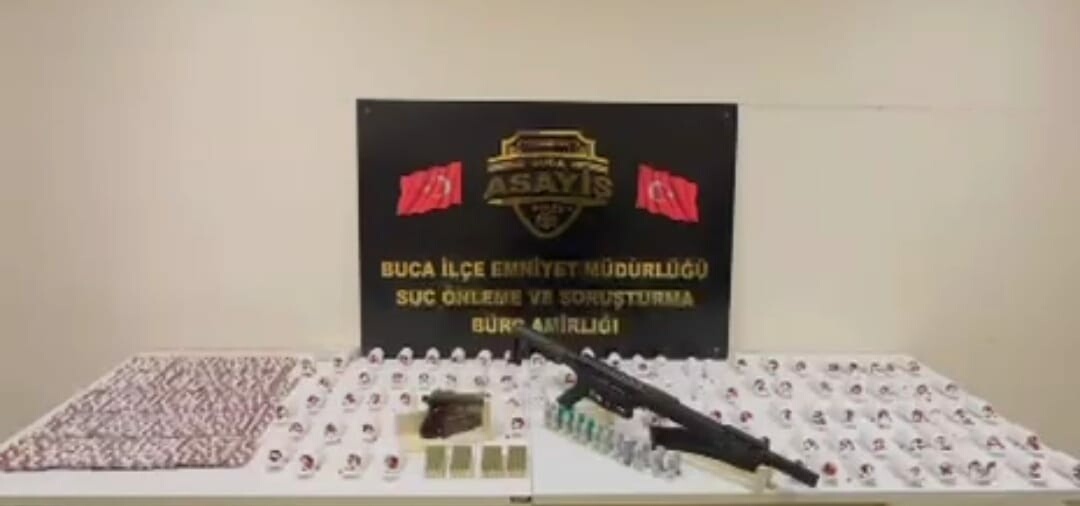 Buca İlçe Emniyet Müdürlüğü ekipleri ekiplerinin uyuşturucu madde ticareti ve ruhsatsız silah bulundurma, taşıma veya satın alma suçlarına yönelik yaptığı çalışmada yakalanan V.B.’nin İnönü Mahallesi’ndeki evinde arama yapıldı. Şüphelinin adresinde yapılan aramada 7 bin sentetik ecza, ruhsatsız tabanca tüfek, ruhsatsız tabanca ve ruhsatsız tüfek ele geçirildi. Gözaltına alına V.B hakkında adli işlem başlatıldı.