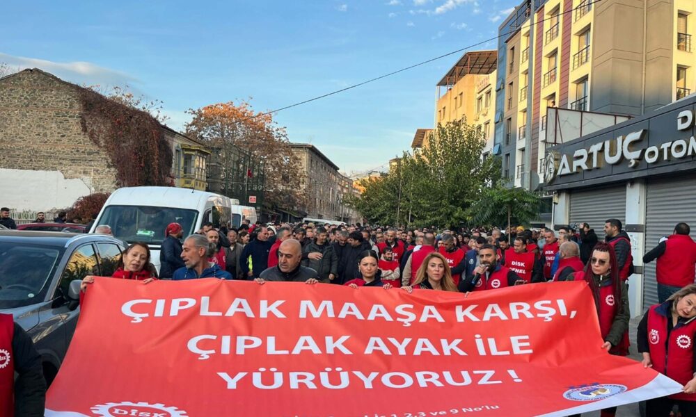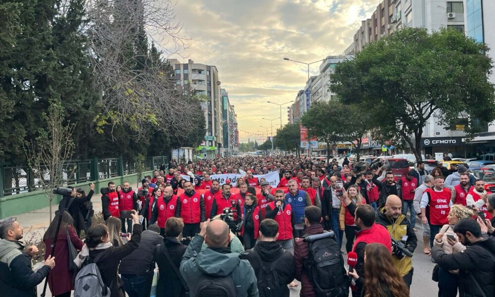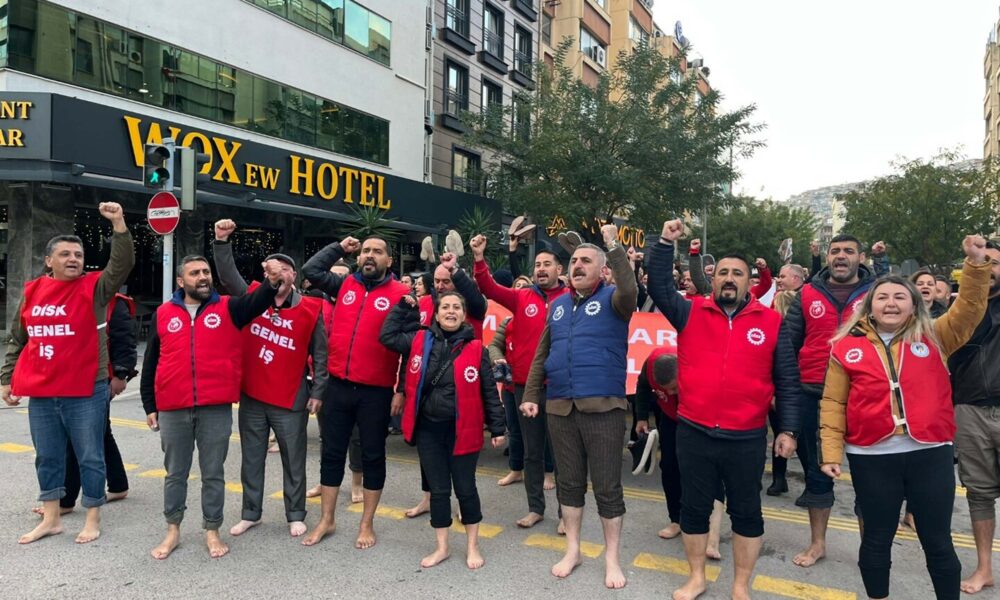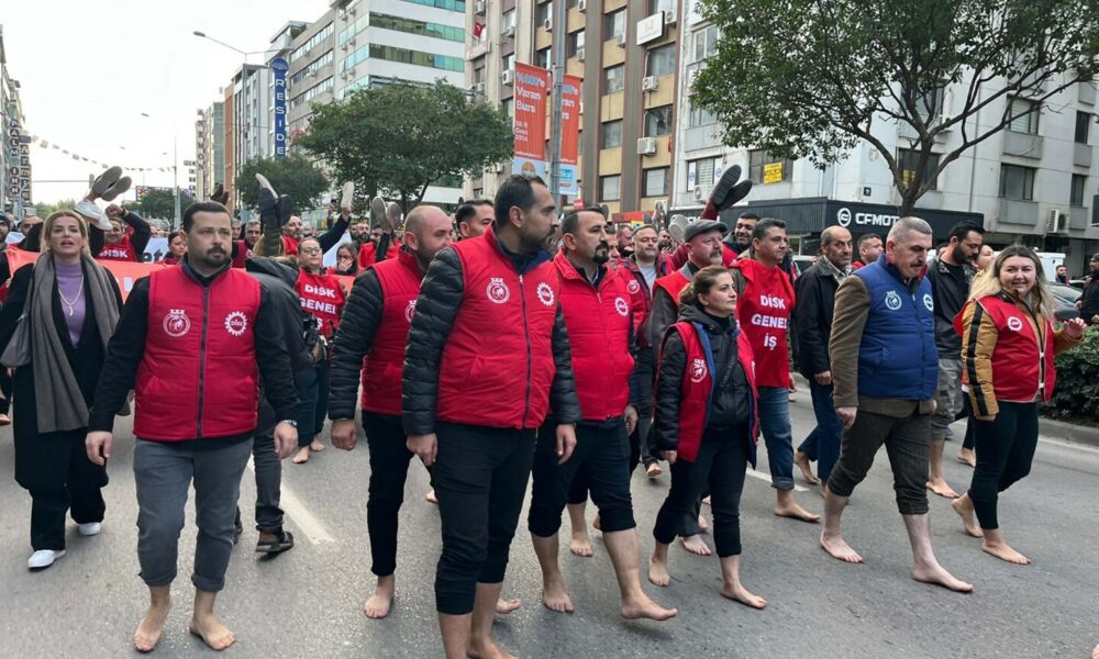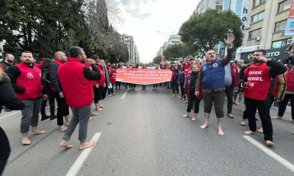 İzmir Büyükşehir Belediyesi iştirakleri İZENERJİ, İZELMAN, İZFAŞ, EGEŞEHİR ve İZTEKdeki aylardır toplu iş sözleşmesi (TİS) ve diğer yan haklar, maaşlarının eksik yatırılması, işten çıkarmalar, çalıştıkları şirkete iade edilmelerine rağmen işbaşı yaptırılmayan üyeler ve ücretlere yönelik haksız uygulama iddiasıyla DİSK/Genel-İş İzmir 1, 2, 3 ve 9 Nolu Şube üyeleri ve 23 bin çalışan eyleme başladı. DİSK Genel-İş Binası önünde bir araya gelen işçiler Kültürpark 9 Eylül Kapısına, Çıplak ücrete, çıplak ayaklı yürüyüş sloganı eşliğinde yalın ayak yürüdü. Yürüyüşün ardından açıklama yapan DİSK/Genel-İş İzmir 2 Nolu Şube Başkanı Ercan Gül, “Haklarımız gasbediliyor, yaşam koşullarımız ağırlaştırılıyor, hukuki kazanımlarımız yok sayılıyor. Toplu İş sözleşmemizin 37nci, 43üncü ve 44üncü maddelerinde açıkça yer alan öğrenim yardımı, ikramiye ve diğer sosyal haklar aylardır ödenmemektedir. Belediye yönetimi, aylardır sürdürdüğümüz tüm görüşmelere rağmen ne ödeme yapmış ne de somut bir ödeme takvimi açıklamıştır. Bu durum, TİSin açık ihlali olduğu kadar, işçilerin ekonomik ve sosyal haklarına yönelik ağır bir saldırıdır” dedi.