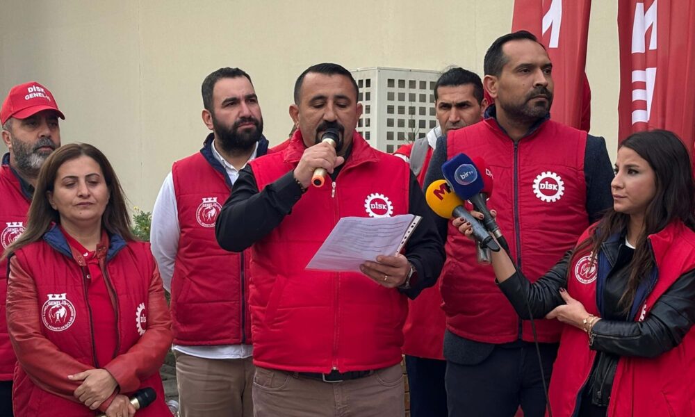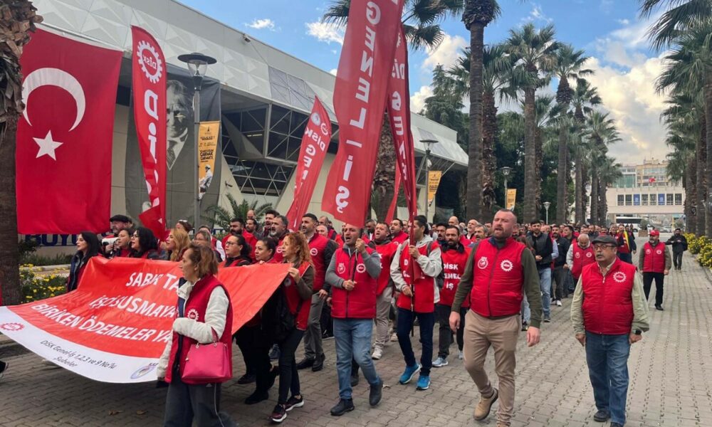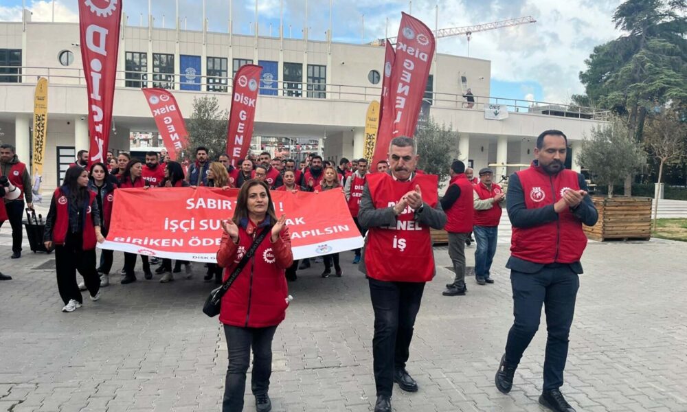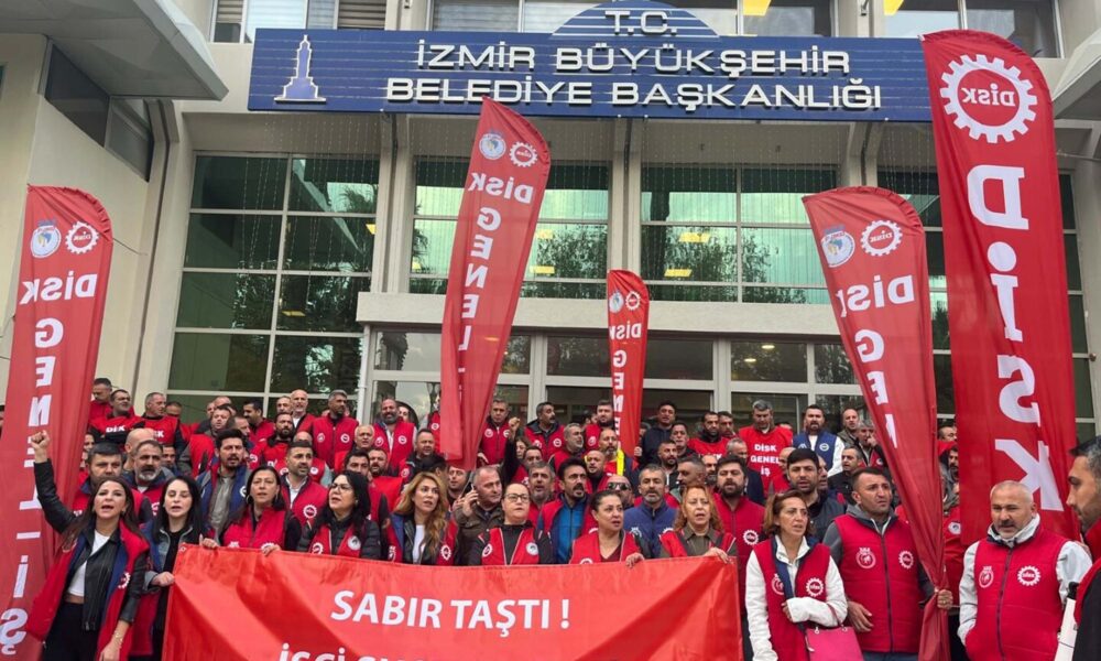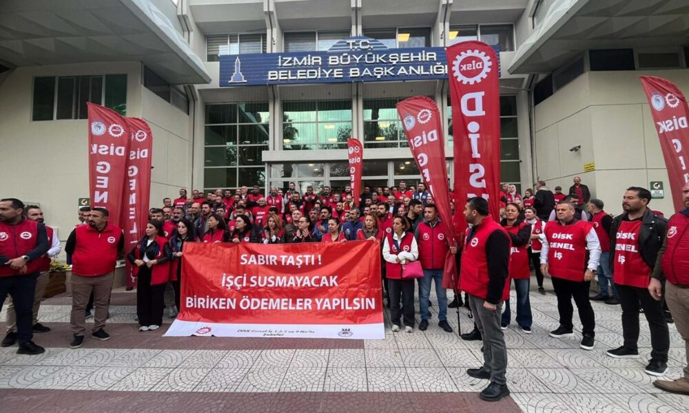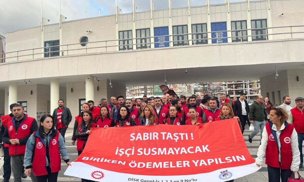 İzmir Büyükşehir Belediyesi bünyesinde bulunan İZENERJİ, İZELMAN VE İZFAŞ şirketlerinde örgütlü DİSK/Genel-İş İzmir 1-2-3-9 No’lu şube üyeleri, çalışanların 3 aydır sosyal haklarının ödenmemesi nedeniyle Kültürpark’taki İzmir Büyükşehir Belediyesi Hizmet Binası önünde bir araya gelerek basın açıklaması yaptı. Açıklamanın ardından ise işçiler oturma eylemi yaptı. Basın açıklamasını yapan DİSK/Genel-İş İzmir 2 Nolu Başkanı Ercan Gül, “Fazla mesai yaparak, daha çok çalışarak evimize bir parça daha fazla ekmek götürmeye çabalıyoruz. Ancak bu çabanın karşılığı olan fazla mesai ücretlerimiz, ikramiyelerimiz ve haklarımız ödenmiyor. Bir yandan geçim derdiyle mücadele ederken, diğer yandan emeğimizin karşılığını alamamanın ağır yükünü yaşıyoruz” dedi.