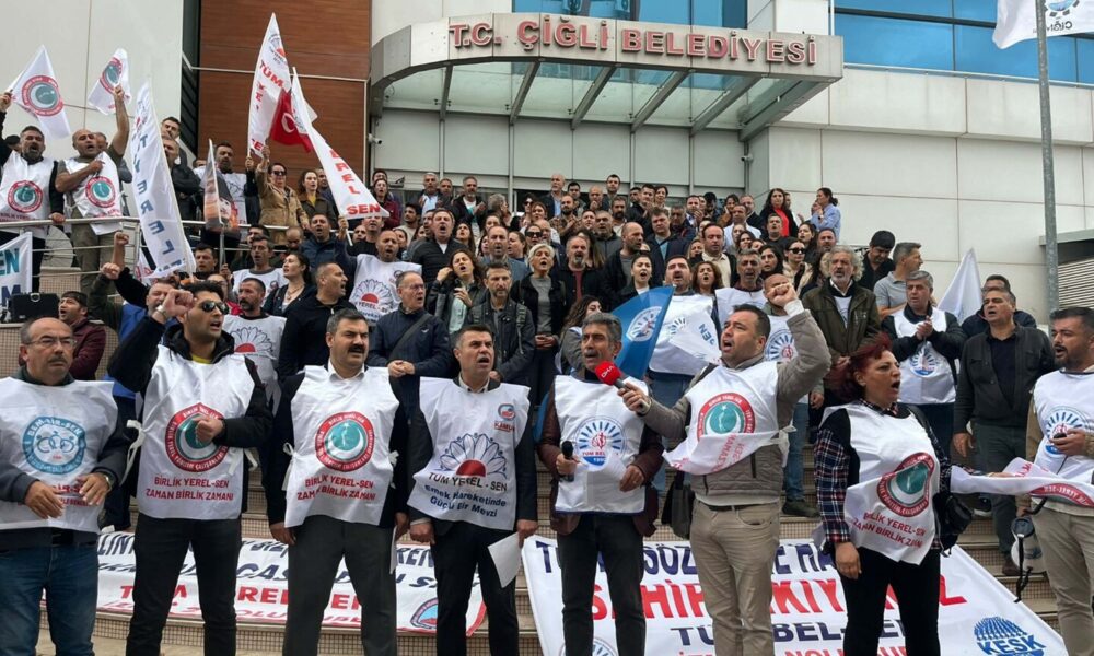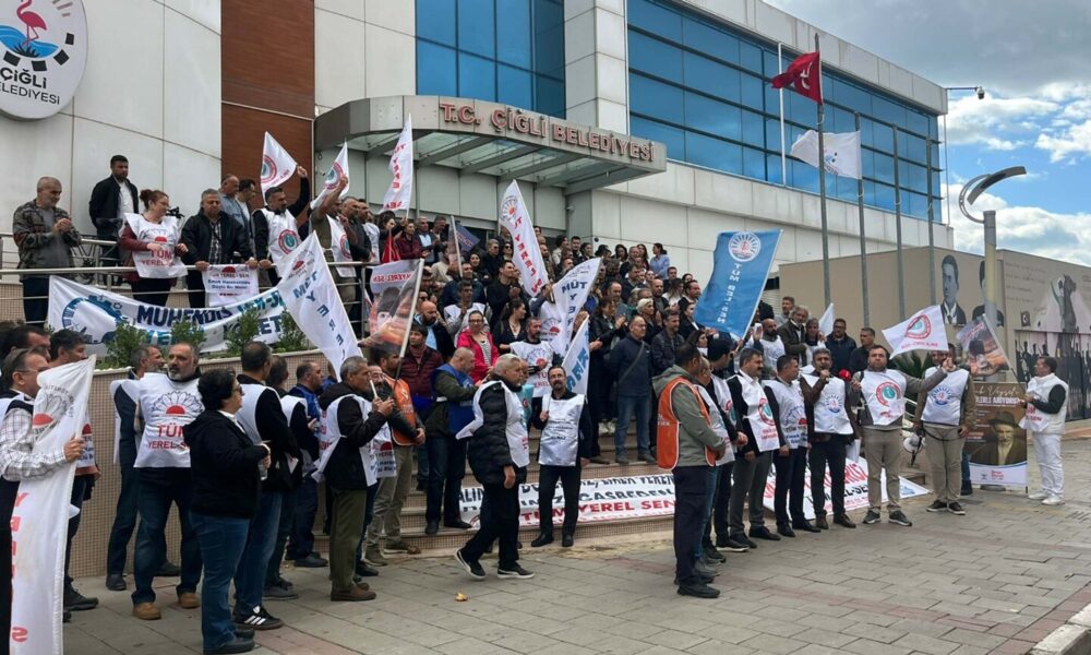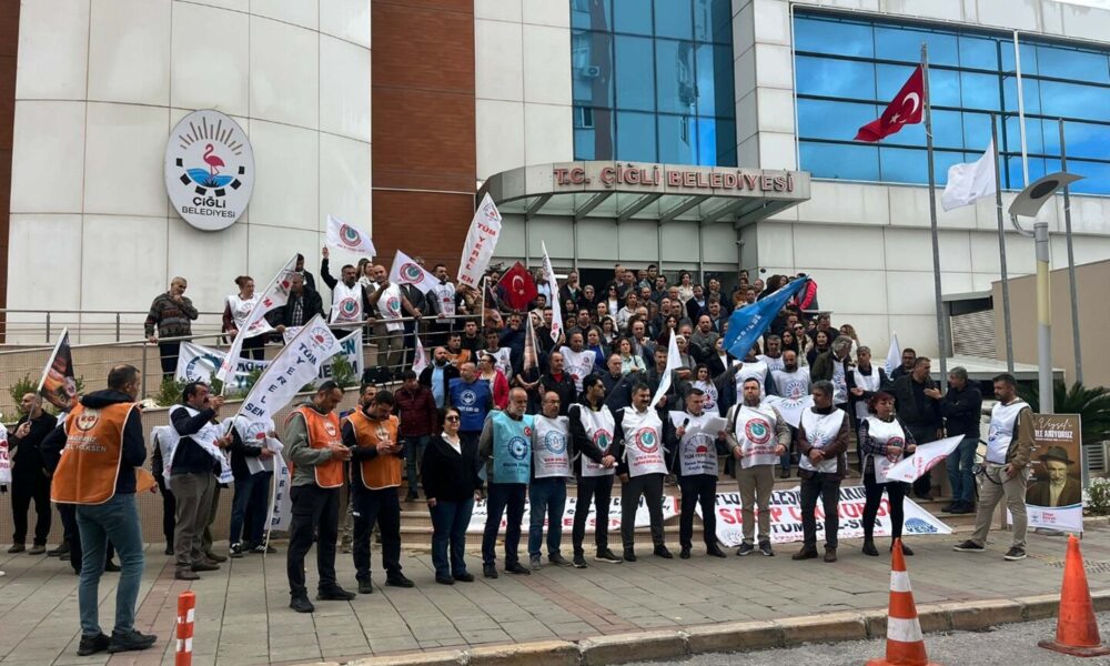 Çiğli Belediyesinde görev alan Tüm Bel-Sen İzmir 2 Nolu Şubeye bağlı memurlar, yaklaşık 5 aylık geriye dönük TİS haklarını alamadıkları gerekçesiyle 1 günlük iş bırakma eylemi kararı aldı. Bu kapsamda belediye binasının önünde bir araya gelen memurlar basın açıklamasında bulundu. Basın açıklamasını okuyan Tüm Bel-Sen İzmir 2 Nolu Şube Başkanı Nihat Filiz, “Sabrımız tükendiği, alın terimiz hiçe sayıldığı için buradayız. Bugün hizmet üretmiyoruz. Bugün hizmet üretiminden gelen gücümüzü kullanıyoruz. Aylardır süren iyi niyetli bekleyiş artık dayanılmaz bir zulme dönüşmüştür. Bizler, Çiğli Belediyesi emekçileri, bu kentin kalbiyiz, damarlarıyız, nefesiyiz. Gün doğumundan gece yarılarına kadar bu kentin düzeni, temizliği ve hizmeti için ter döken biziz. Ama biz bu kenti yaşatırken, belediye yönetimi bizi yok sayıyor, görmezden geliyor” dedi.