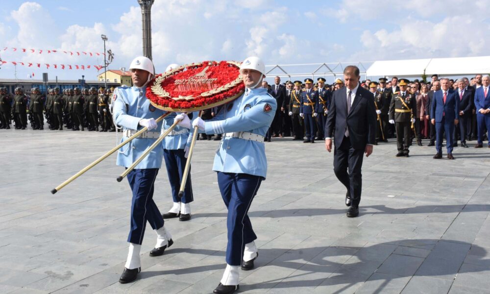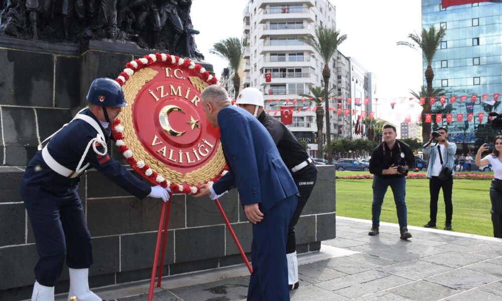 29 Ekim Cumhuriyet Bayramı kutlamaları kapsamında, Cumhuriyet Meydanındaki Atatürk Anıtına İzmir Valiliği, Garnizon Komutanlığı ve İzmir Büyükşehir Belediyesine ait çelenkler konuldu. Törene; İzmir Valisi Süleyman Elban, Ege Ordusu ve Garnizon Komutanı Orgeneral İrfan Özsert, İzmir Büyükşehir Belediye Başkanı Cemil Tugay, AK Parti İzmir İl Başkanı Bilal Saygılı, MHP İzmir İl Başkanı Veysel Şahin, milletvekilleri, STK ve oda temsilcileri ve kent protokolü katıldı. Çelenk töreninin ardından Hükümet Konağı önünde Bayraklı Halk Eğitimi Merkezi folklor ekibi tarafından halk oyunları gösterisi icra edildi. Daha sonra hafta boyunca Konak Atatürk Meydanında elle dokunan Türk bayrağını öğrenciler, İl Milli Eğitim Müdürü Ömer Yahşi eşliğinde İzmir Valisi Süleyman Elbana teslim etti.