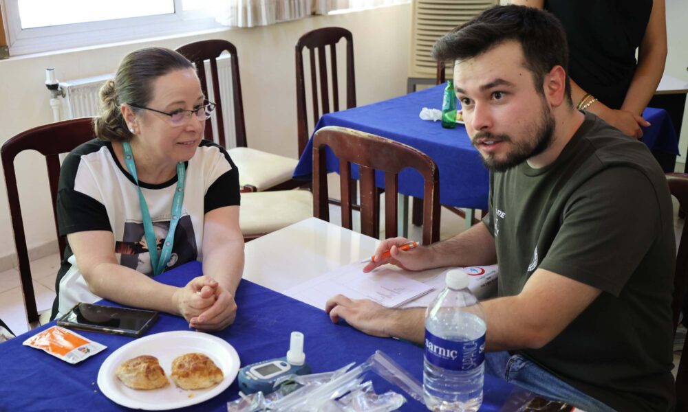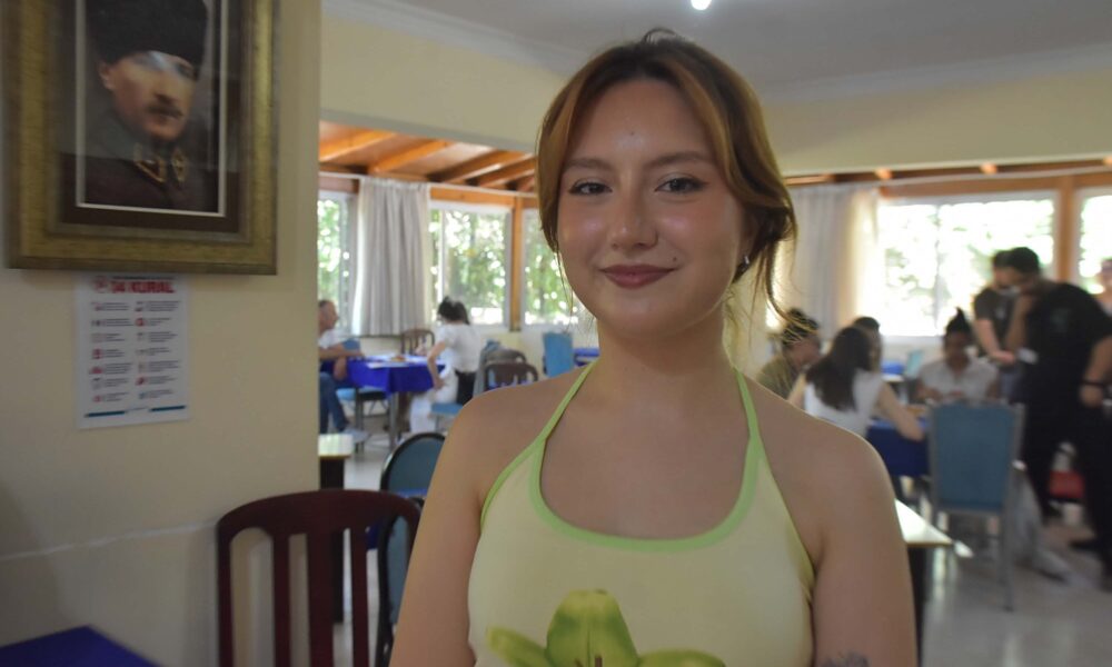 Prof. Dr. Oğuz Kılınç, tıp fakültesi öğrencileri ile birlikte Bilim Kafe etkinliği kapsamında Balçova Emekli Astsubaylar Dernek Lokali'ni ziyaret etti.i Defne Pınar Özer (Fotoğrafta).Fotoğraf:Nevra UÇKAÇ/İzmir,(DHA)