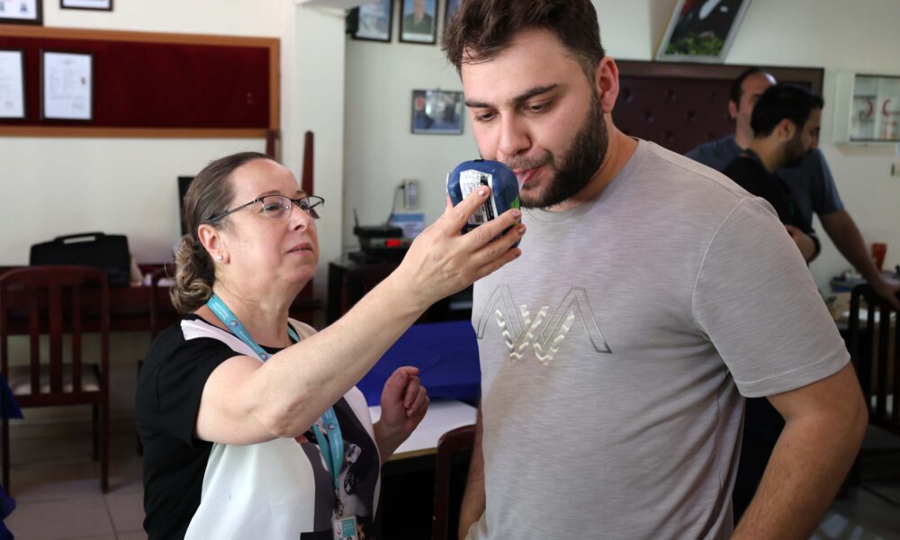 Prof. Dr. Oğuz Kılınç, tıp fakültesi öğrencileri ile birlikte Bilim Kafe etkinliği kapsamında Balçova Emekli Astsubaylar Dernek Lokali'ni ziyaret etti. Servet Ulutaş (Fotoğrafta).Fotoğraf:Nevra UÇKAÇ/İzmir,(DHA)