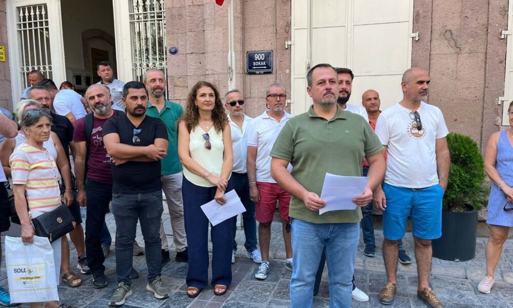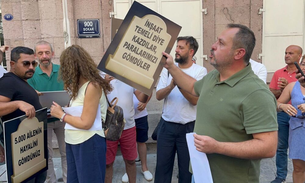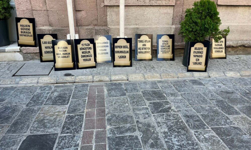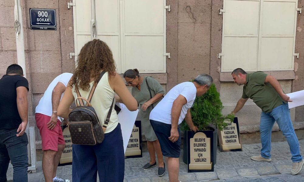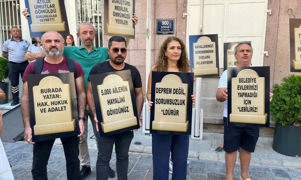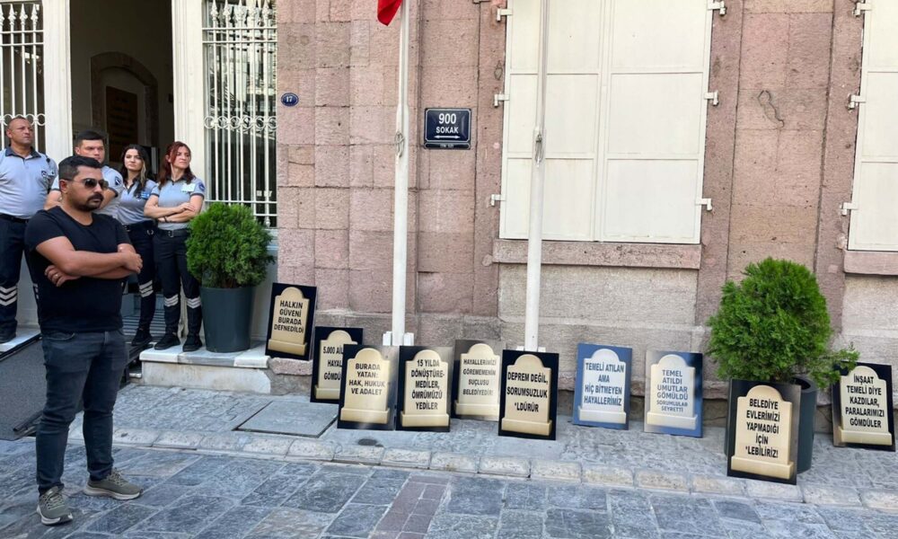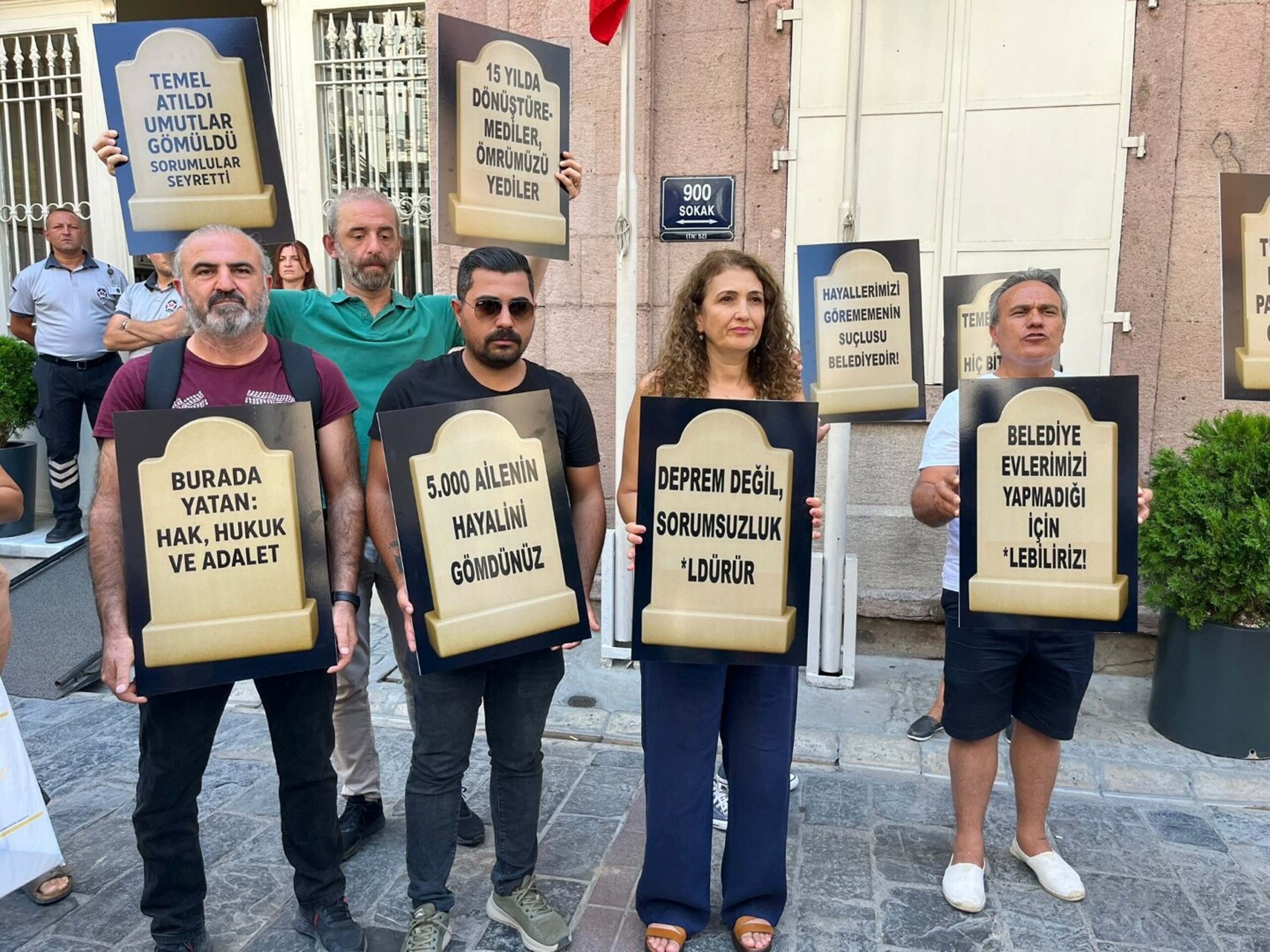 İzmir’de kentsel dönüşüm projelerinde yaşanan aksaklıklar nedeniyle mağduriyet yaşayan kooperatif üyeleri, İzmir Büyükşehir Belediyesi Egemenlik Binası önünde basın açıklaması yaptı. Ödemelerini yaptıkları depreme dayanıklı evlerini istediklerini belirtip, İzmir Büyükşehir Belediye Başkanı Cemil Tugay’a seslenen mağdurlar, ellerinde tuttukları mezar taşı dövizlerini bina önüne bıraktı. Dövizlerde İnşaat temeli diye kazdılar paramızı gömdüler, Deprem değil, sorumsuzluk öldürür, 5000 ailenin hayalini gömdünüz, Burada yatan: Hak, Hukuk ve Adalet ifadeleri dikkat çekti.