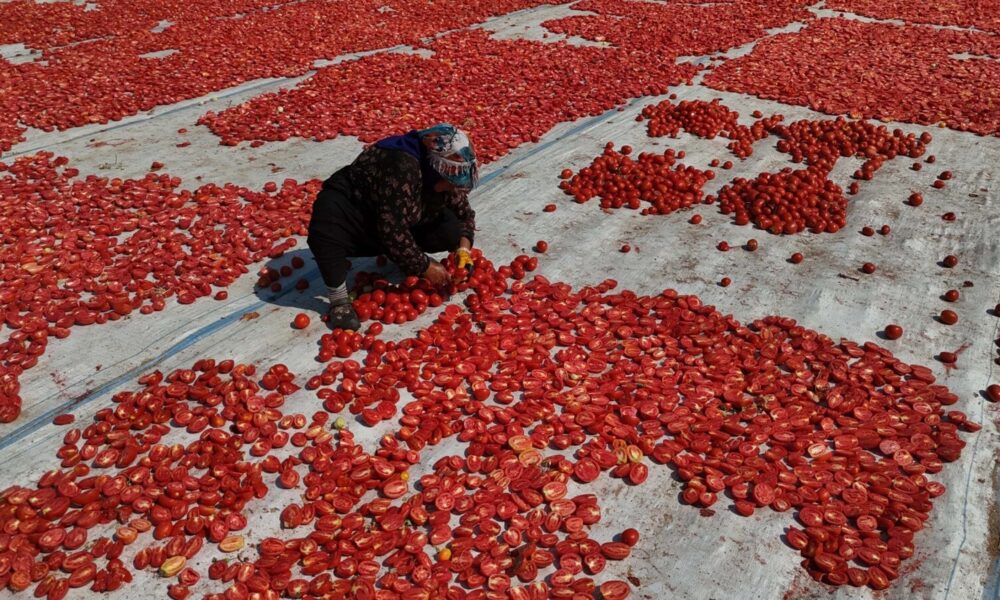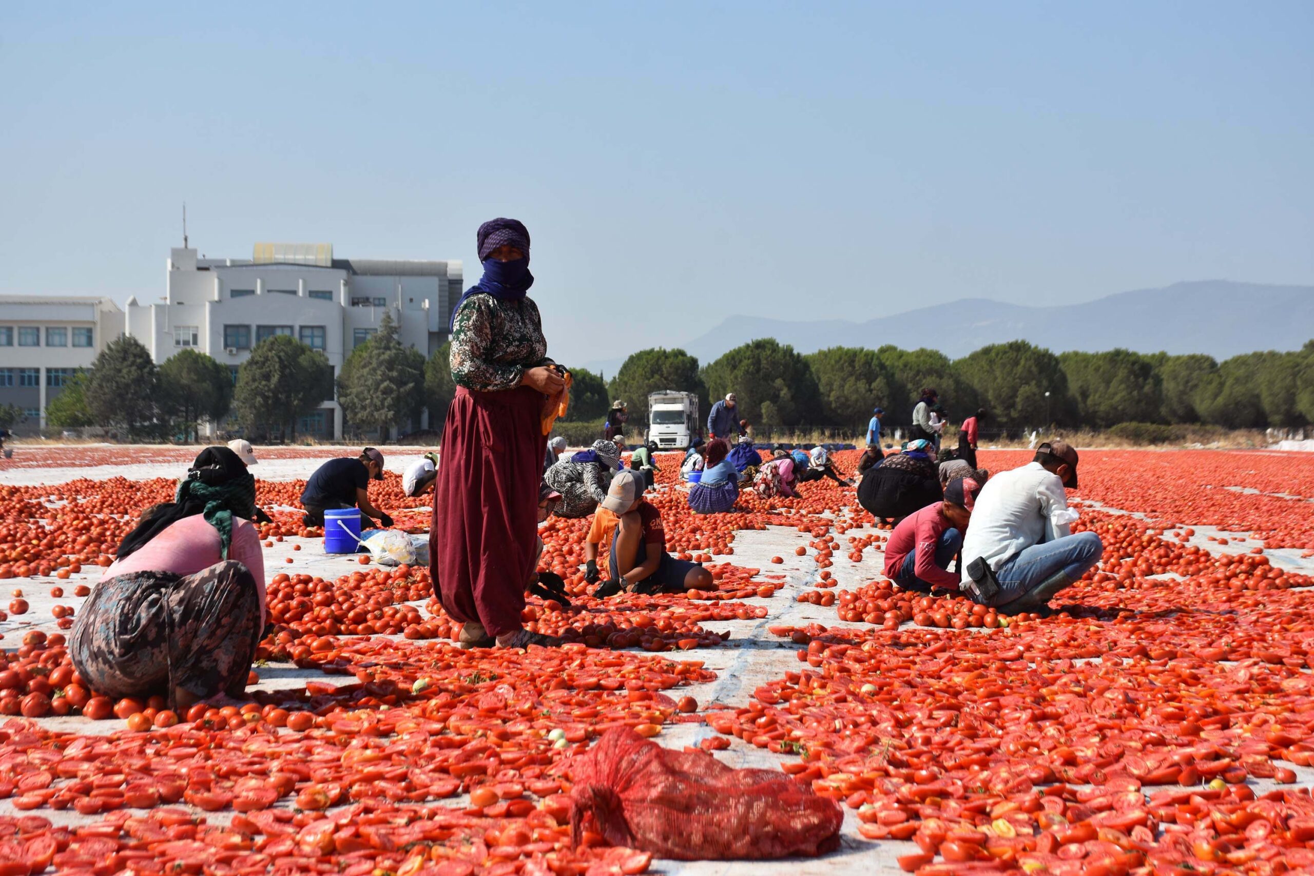 Türkiye'nin domates üretiminde en önemli merkezlerinden biri olan İzmir'in Torbalı ilçesinde kuru domates mesaisi devam ediyor.Fotoğraf:Seza Nur ALPDÜNDAR/İzmir,(DHA)