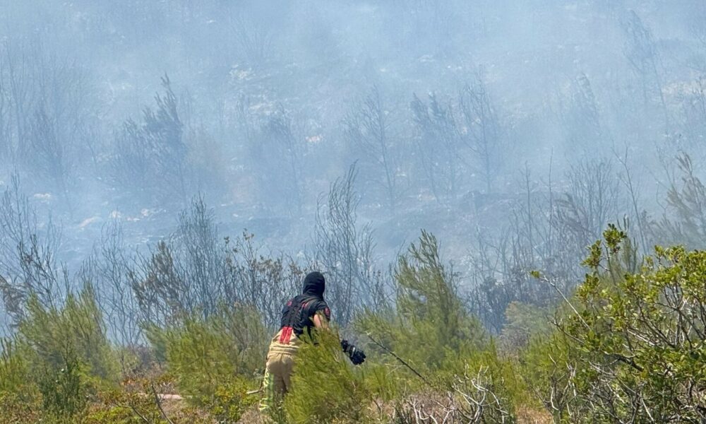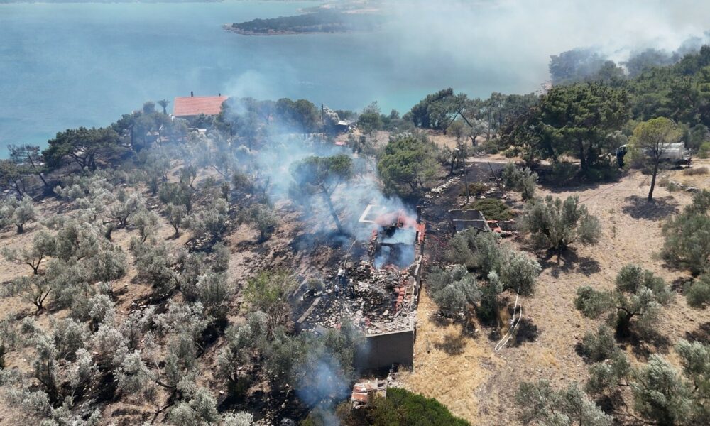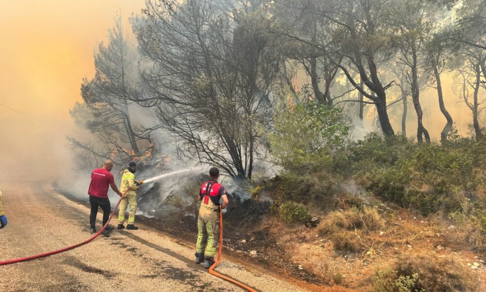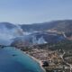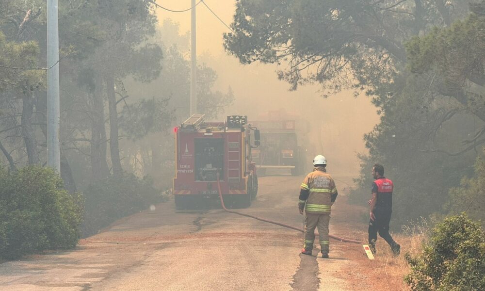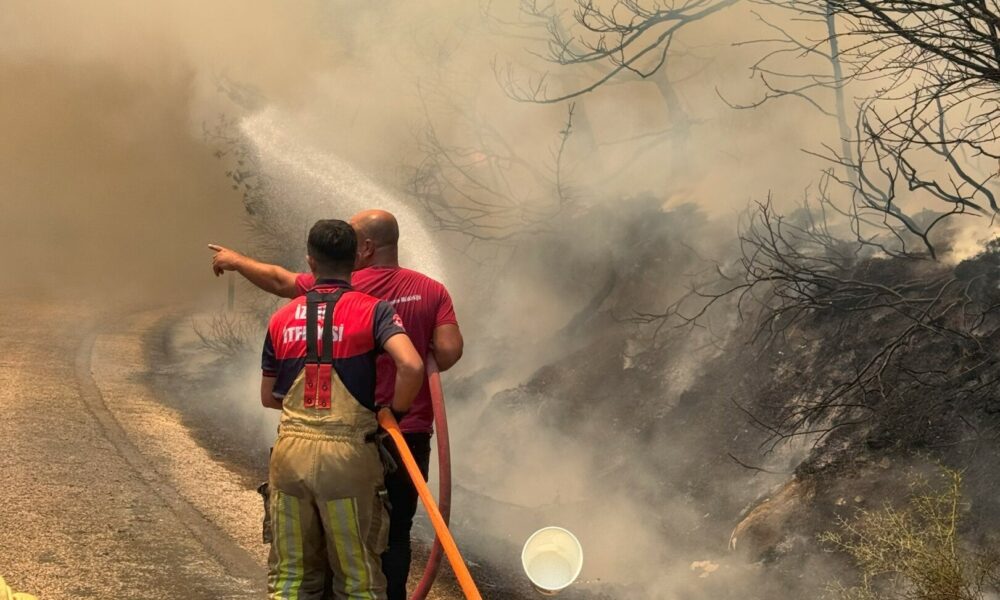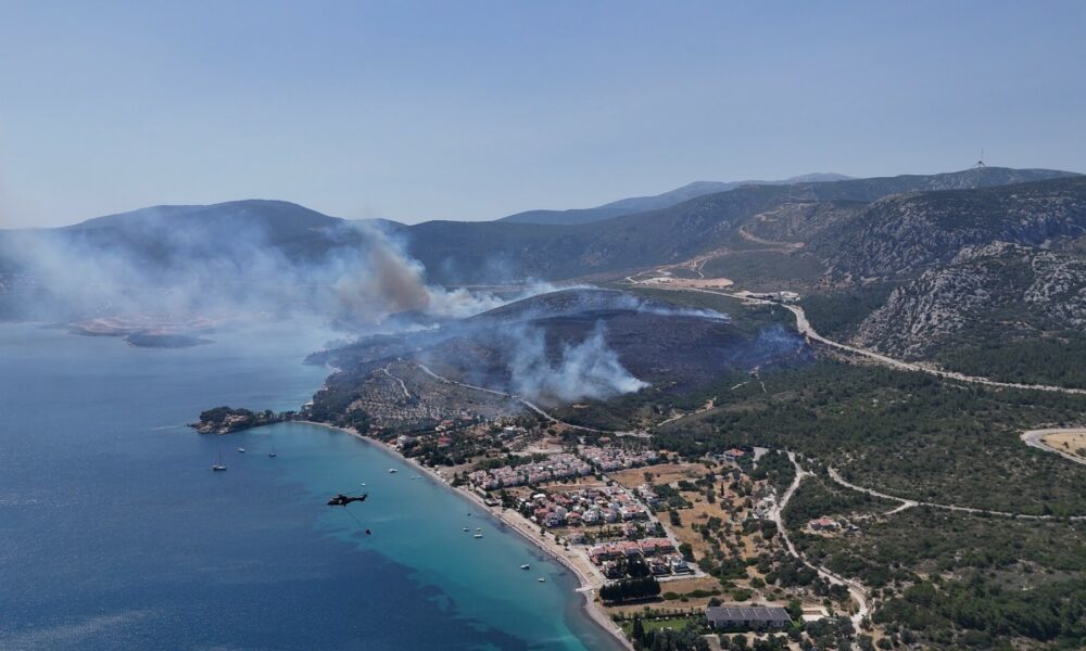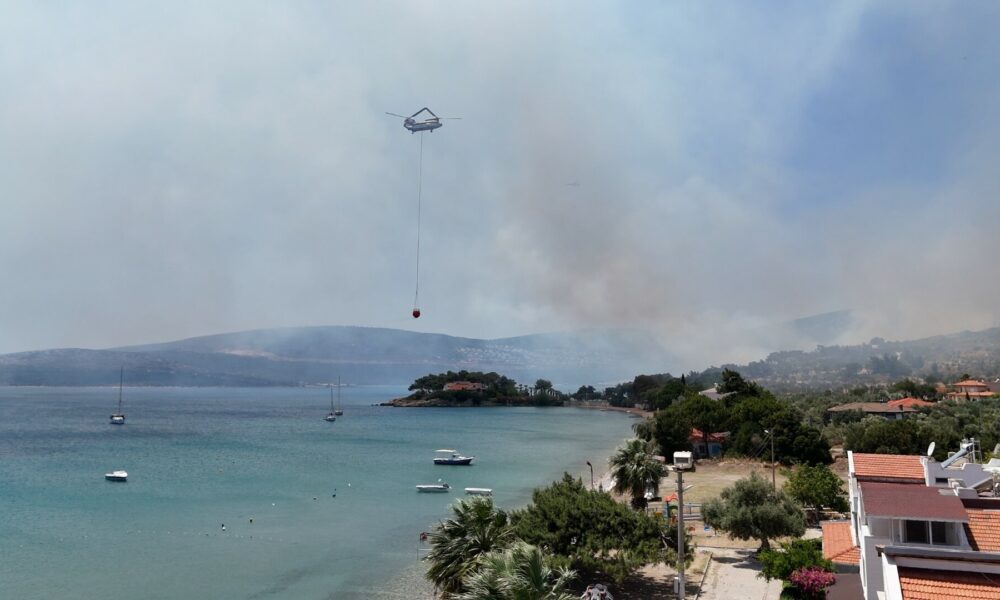İzmir'in Karaburun ilçesindeki orman yangınına AFAD, Orman Bölge Müdürlüğü ve İzmir Büyükşehir Belediyesi'ne bağlı itfaiye ekiplerinin havadan ve karadan müdahale sürüyor. Fotoğraf:İzmir,(DHA)