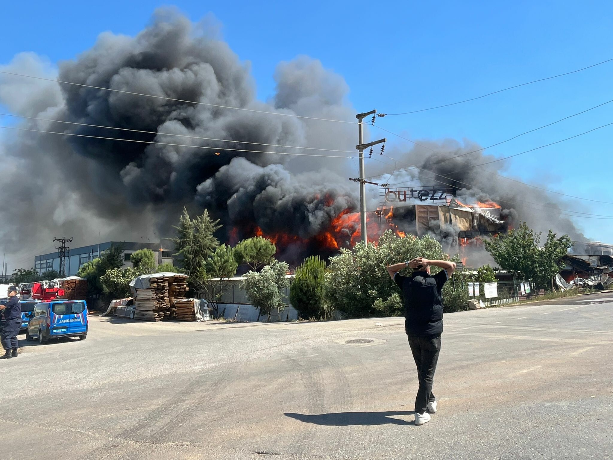 İzmir'in Torbalı ilçesindeki sandalye fabrikasında yangın çıktı. Bölgeye sevk edilen ekipler, yangına müdahale ediyor. Fotoğraf: İzmir,(DHA)