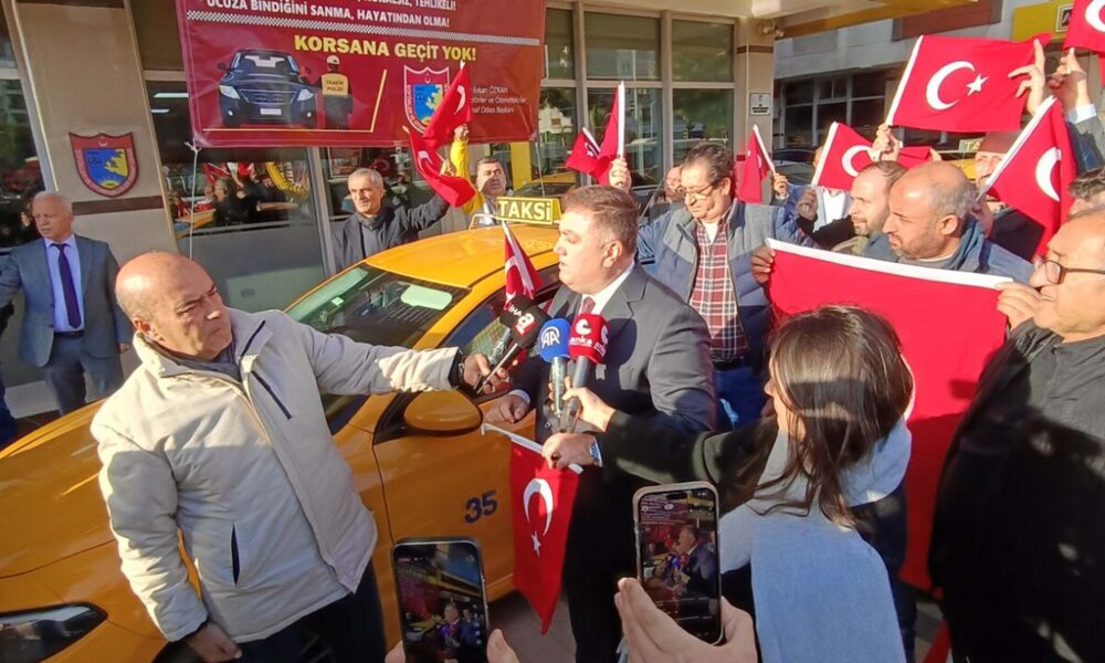 • İzmir Şoförler ve Otomobilciler Esnaf Odası Başkanı Erkan Özkan, ortada. Fotoğraf: İzmir,(DHA)