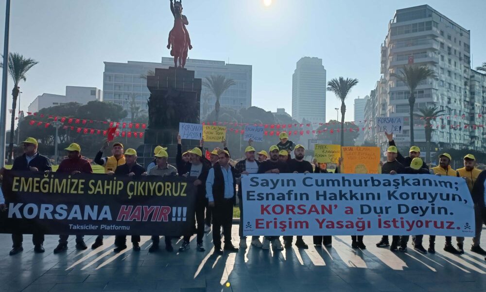Taksici esnafı, sabah saatlerinde korsan taşımacılığa tepki göstermek için Alsancak Stadı önünde toplandı. Çok sayıda taksi şoförü, kornalarla Şehitler Caddesinden Liman Caddesine, oradan da Cumhuriyet Meydanına konvoy yaptı. Araçlarına Türk bayrağı asan taksiciler, sahil şeridinde tek sıra halinde park edip kontak kapattı. Korsana dur deyin, Erişim yasağı istiyoruz, Emeğimize sahip çıkıyoruz, Sayın Cumhurbaşkanım esnafın hakkını koruyun yazılı döviz ve pankartlar taşıyan topluluğa, aileleri de destek verdi.