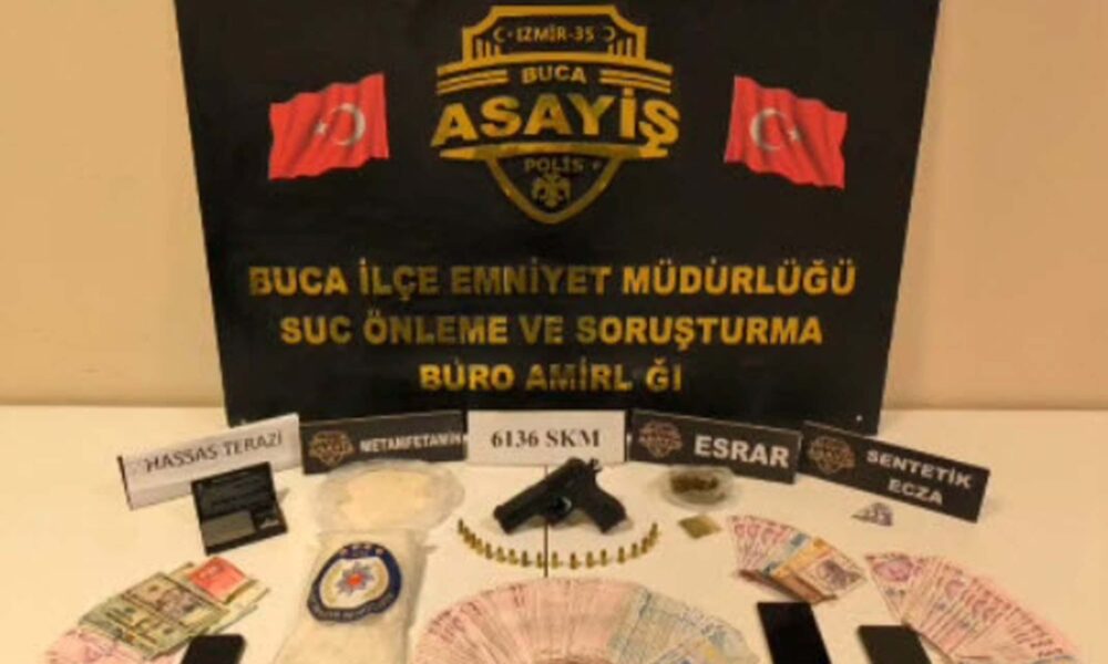 Buca İlçe Emniyet Müdürlüğü ekipleri, uyuşturucu madde ticaretine ve imalatına yönelik çalışma yaptı. Ekipler, Şirinkapı Mahallesinde bazı şüphelilerin uyuşturucu madde bulundurduğunu tespit etti. Dün yapılan operasyonda, şüphelilerin ev ve araçlarında arama yapıldı. Aramalarda 1 kilo 611 gram metamfetamin, 1 ruhsatsız tabanca, 18 gram esrar ve 1 hassas terazi ele geçirildi. Operasyonda T.G., H.S. ve S.İ., gözaltına alındı. 3 şüpheli emniyetteki işlemlerinin ardından adliyeye sevk edildi.