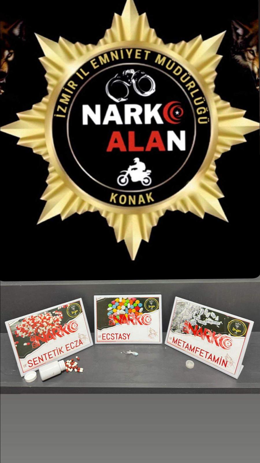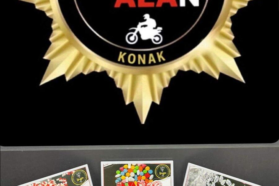 İzmir İl Emniyet Müdürlüğü’ne bağlı Narkotik Suçlarla Mücadele Şube Müdürlüğü ve Konak İlçe Emniyet Müdürlüğü ekiplerince oluşturulan Narkoalan timleri, 1-14 Ekim 2025 tarihleri arasında 11 farklı işyeri ve ev adreslerine operasyon düzenledi. Uyuşturucu ve silah ticaretine yönelik yapılan çalışmada, 103 gram bonzai, 14 gram kokain, 14 gram metamfetamin, 849 adet sentetik hap, 17,91 gram esrar, 3 hassas terazi, 15 bin 50 TL nakit para, 3 tabanca, 2 pompalı tüfek, 44 fişek ile çok sayıda silah parçası ele geçirildi.