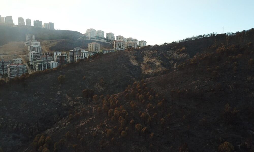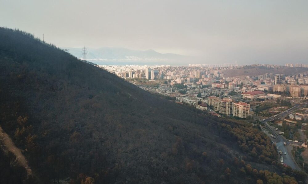 İzmir'de Karşıyaka Yamanlar Dağı'nda dün gece başlayan ve rüzgarın da etkisiyle yayılan yangını söndürme çalışmaları sürüyor. Yanan ormanın korkunç tablosu hava aydınlanınca ortaya çıktı. Fotoğraf: İZMİR, (DHA)