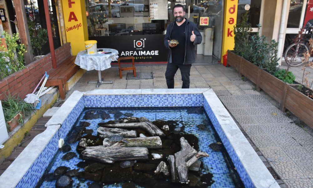 İzmirli fotoğrafçı, yılda 500 kaplumbağayı dükkanın önündeki havuzda besliyor
