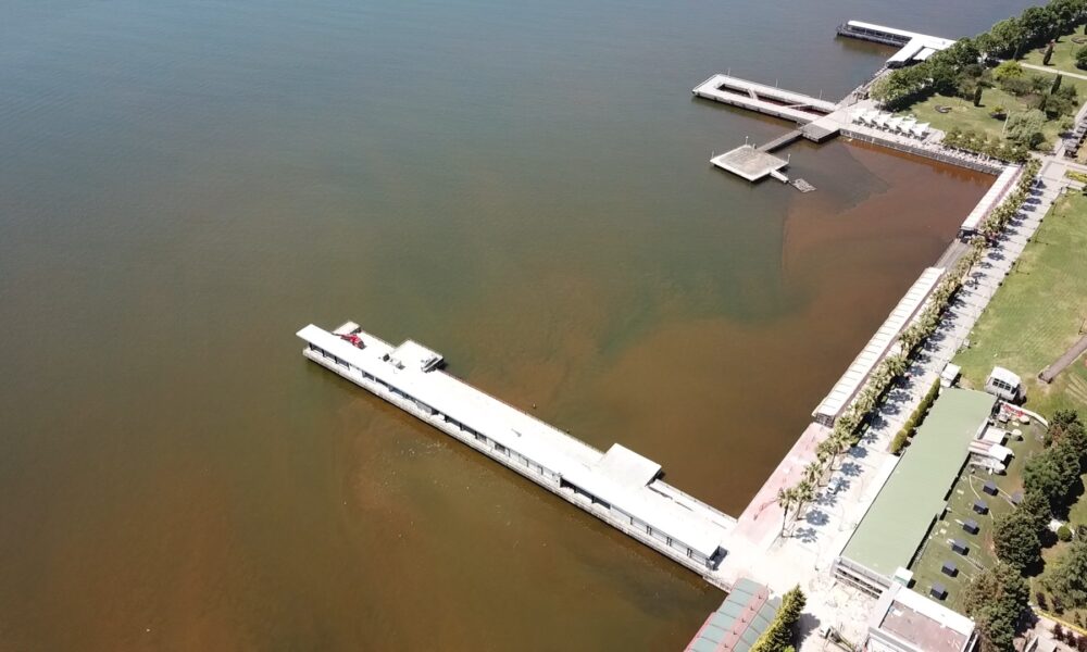 • İzmit Körfezi’nde kıyıya yakın bölgelerde deniz suyu kahverengiye büründü. Yaşanan değişim havadan görüntülendi. Fotoğraf: Nazım Özgün ERBULAN/İzmit(Kocaeli), (DHA)