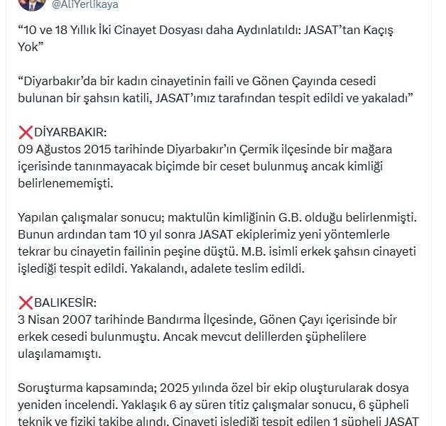 İçişleri Bakanı Ali Yerlikaya, JASAT tarafından yapılan çalışmaları sosyal medya hesabından paylaştı. Buna göre; 9 Ağustos 2015’te Diyarbakırın Çermik ilçesinde bir mağara içerisinde tanınmayacak biçimde bir ceset bulundu. Yapılan çalışmalar sonucu maktulün kimliğinin G.B. olduğu belirlendi. Olaydan 10 yıl sonra JASAT ekipleri yeni yöntemlerle failin peşine düştü. M.B. isimli erkek şüphelinin cinayeti işlediği tespit edildi. Yakalanan şüpheli, adalete teslim edildi.