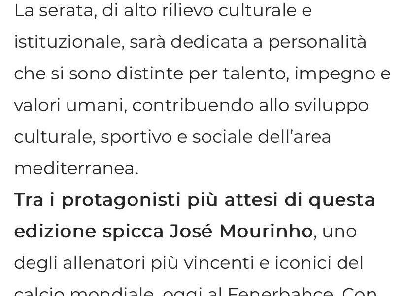 Jose Mourinho, Uluslararası “Akdeniz Mükemmellik Ödülü” törenine davet edildi