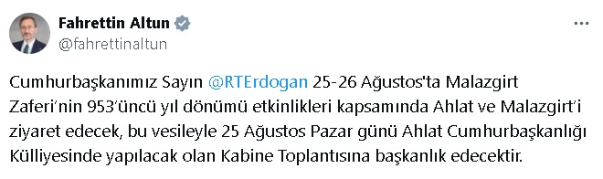 İletişim Başkanı Altun, sosyal medya hesabından yaptığı açıklamalarda, “Cumhurbaşkanımız Recep Tayyip Erdoğan 25-26 Ağustosta Malazgirt Zaferi’nin 953’üncü yıl dönümü etkinlikleri kapsamında Ahlat ve Malazgirt’i ziyaret edecek, bu vesileyle 25 Ağustos Pazar günü Ahlat Cumhurbaşkanlığı Külliyesinde yapılacak olan Kabine Toplantısına başkanlık edecektir” dedi.