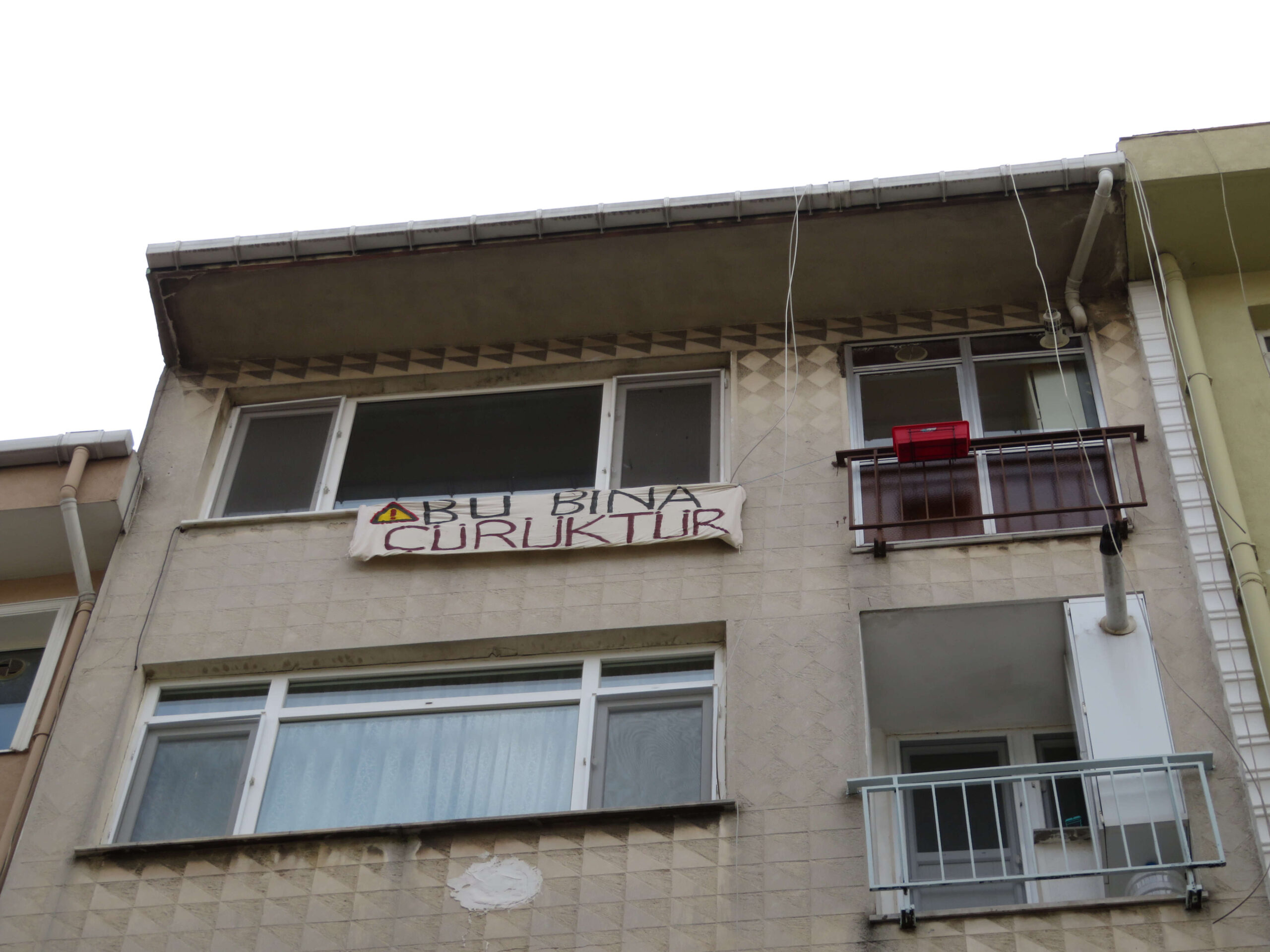 KADIKÖY’de 5 katlı apartmanın en üst katında oturan kiracı, ‘Bu bina çürüktür’ yazılı pankart asıp evi boşalttı.