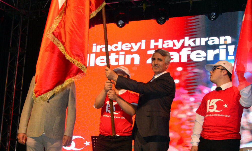 Daha sonra Gençlik ve Spor İl Müdürlüğü tarafından düzenlenen koşuya katılanlar Vali Mükerrem Ünlüer’e 15 Temmuz şehitleri sancağını teslim etti.