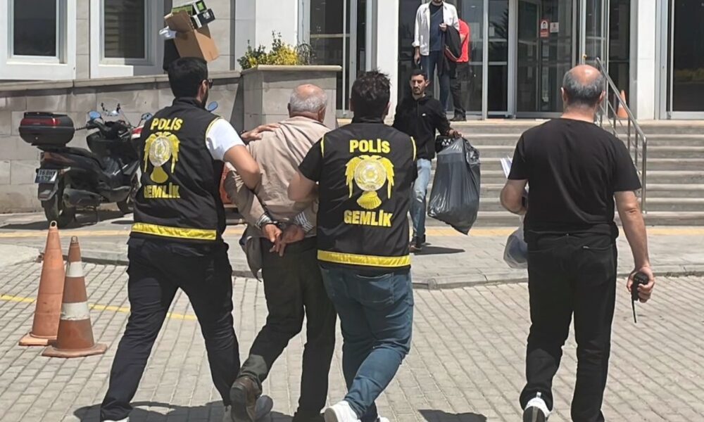 Bursa'nın Gemlik ilçesinde 'alacak' nedeniyle husumetli olduğu Mustafa K.’nin silahlı saldırısına uğrayan Ümit Tunç (53), hastanede hayatını kaybetti. Şüpheli Mustafa K. (Kahverengi hırkalı) adliyeye sevk edildi. Fotoğraf: Bursa, (DHA)