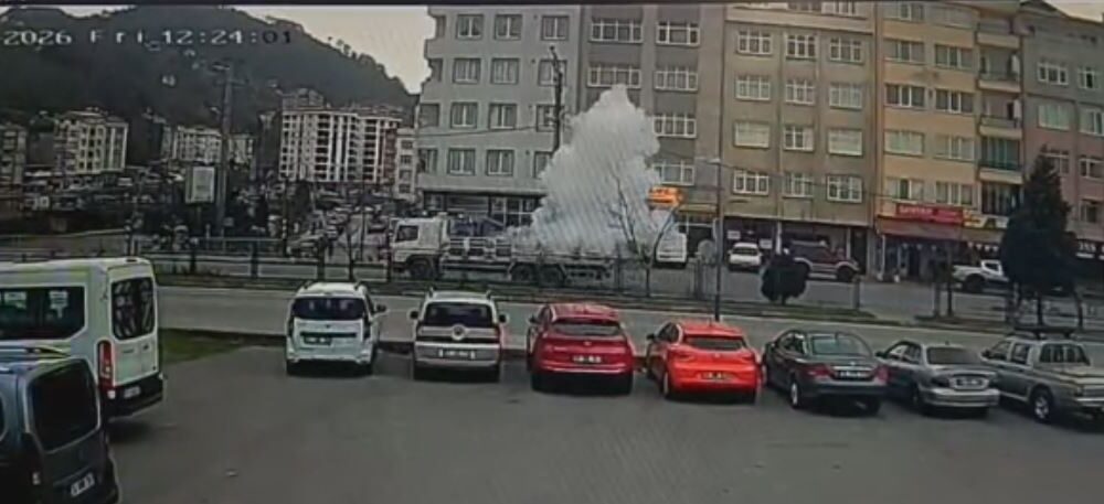 Patlama anı ise çevredeki iş yerinin güvenlik kamerasına yansıdı. Görüntülerde; ilçe merkezinden geçen kamyonun kasasında patlamayla birlikte yangın tüpünün havalandığı ve çevreye yoğun dumanların yayıldığı anlar yer aldı.