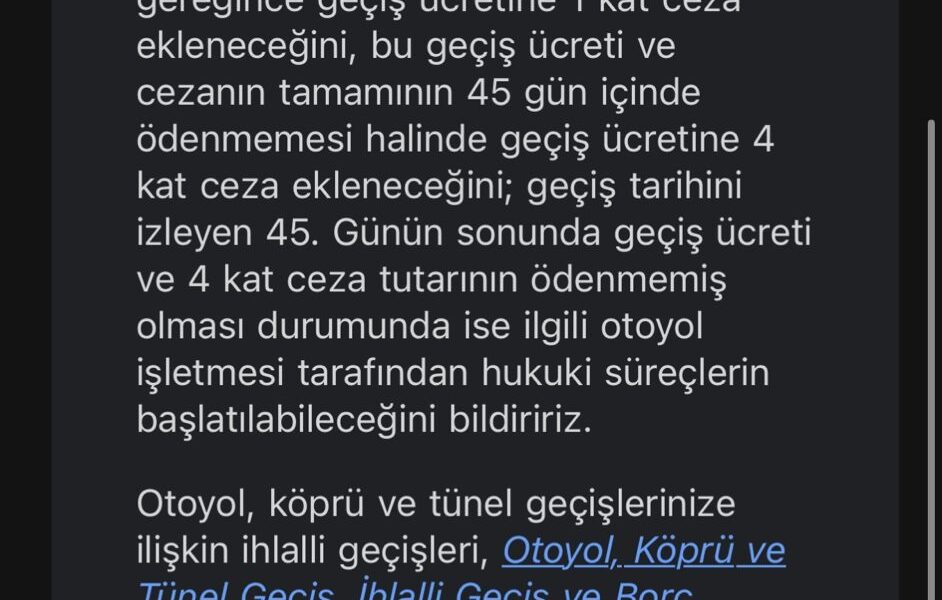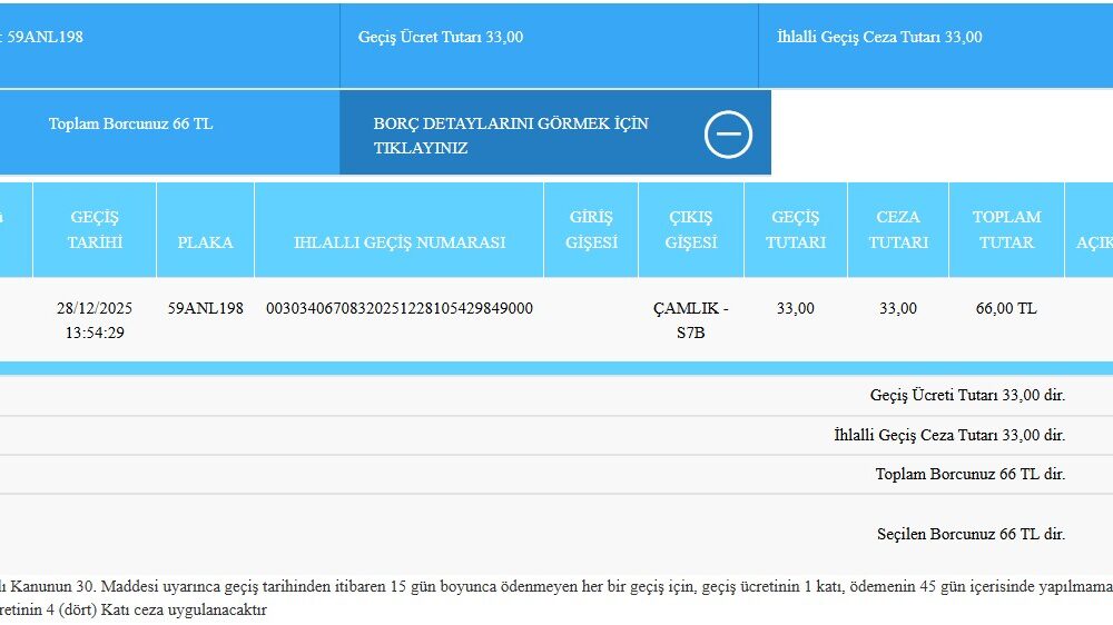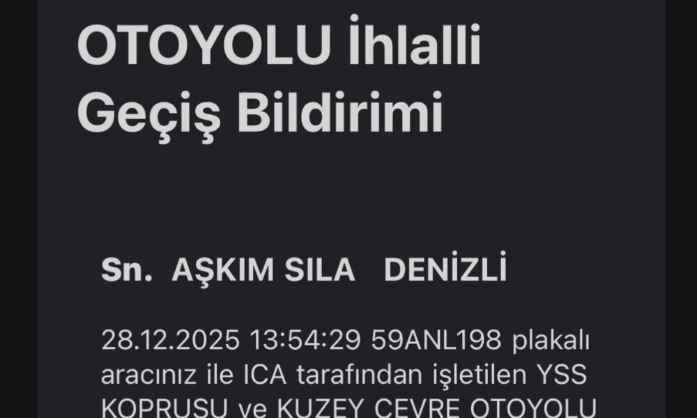 İhbarnamede, cezanın vaktinde ödenmemesi halinde 4 katına çıkacağı belirtilerek, “28.12.2025 tarihinde saat 13.54’te 59 ANL 198 plakalı aracınız ile ICA tarafından işletilen YSS Köprüsü ve Kuzey Çevre Otoyolu’nda Çamlık-S7B gişesinden yapmış olduğunuz geçiş ihlalli geçiş olarak kaydedilmiştir. Tahakkuk eden geçiş ücretini, geçiş tarihini izleyen 15 gün içinde cezasız olarak ödeyebileceğinizi, ödemenin geçiş tarihini izleyen 15 gün içinde yapılmaması halinde 6001 Sayılı Kanun gereğince geçiş ücretine 1 kat ceza ekleneceğini, bu geçiş ücreti ve cezanın tamamının 45 gün içinde ödenmemesi halinde geçiş ücretine 4 kat ceza ekleneceğini; geçiş tarihini izleyen 45inci günün sonunda geçiş ücreti ve 4 kat ceza tutarının ödenmemiş olması durumunda ise ilgili otoyol işletmesi tarafından hukuki süreçlerin başlatılabileceğini bildiririz” ifadesi yer aldı.