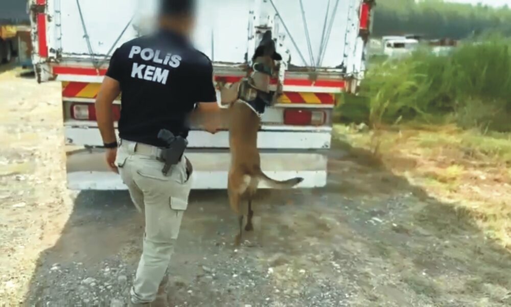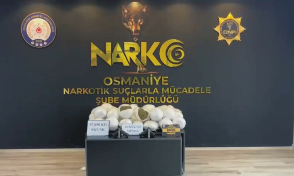Osmaniye İl Emniyet Müdürlüğü Narkotik Suçlarla Mücadele Şubesi ekipleri, uyuşturucu madde bulunduğunu belirlediği bir kamyonu ve ona öncülük eden otomobili, uygulama noktasında durdurdu. Otoparka çekilerek, narkotik köpeği ‘Jardi’ ile yapılan detaylı aramada, kamyon dorsesinde saman çuvalları arasına gizlenmiş 57 kilo 850 gram skunk, 2 ruhsatsız tabanca ve 22 mermi ele geçirildi. Uyuşturucu veya uyarıcı madde imal ve ticareti suçundan gözaltına alınan araçlardaki Azad A., Cihan A., Hasan S. ve Sedat Z., emniyetteki işlemlerinin ardından sevk edildikleri hakimlikçe tutuklanarak cezaevine teslim edildi.