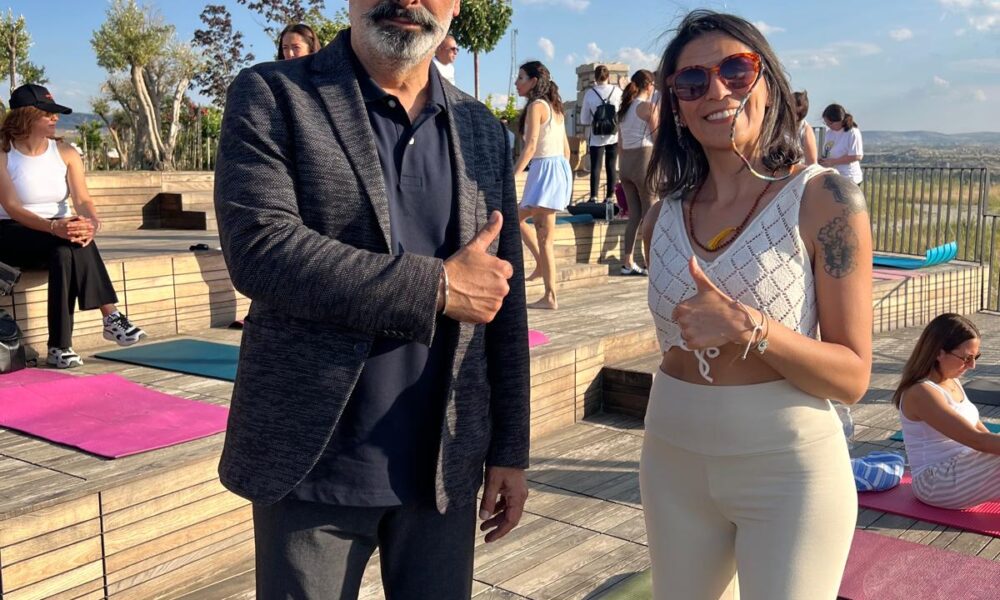 • Ürgüp Belediye Başkanı Ali Ertuğrul Bul (Solda), yoga eğitmeni Sinem Sak (Sağda) Fotoğraf: Ahmet KORKMAZER/Nevşehir, (DHA)