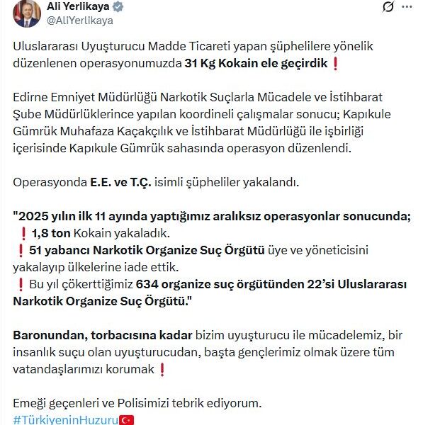 İçişleri Bakanı Ali Yerlikaya, Kapıkule Gümrük Muhafaza Kaçakçılık ve İstihbarat Müdürlüğü ile polis tarafından ortaklaşa düzenlenen operasyonu sosyal medya hesabından duyurdu. Buna göre; uluslararası uyuşturucu madde ticareti yapan şüphelilere yönelik operasyonda 31 kilogram kokain ele geçirildi. E.E. ve T.Ç. isimli 2 şüpheli yakalandı.