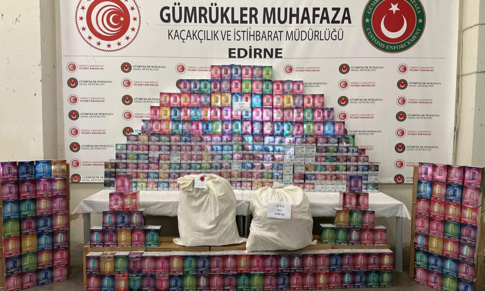 İl Gümrük Muhafaza Kaçakçılık ve İstihbarat Müdürlüğü ekipleri, Kosova’dan yurda girmek üzere Kapıkule’ye gelen otomobili şüphe üzerine X-Ray taramasına sevk etti. Araçta yoğunluk tespit edilmesi üzerine narkotik köpek Alfa ile arama yapıldı. Aramada, otomobilin ön şoför ve yolcu koltukları altına yapılan zulada 38 poşette 29 kilo 576 gram esrar ele geçirildi. Türkiye’ye giriş yapmak üzere Kapıkule’ye gelen TIR’da ise yapılan detaylı incelemede, beyan edilmeyen 20 bin elektronik sigara ele geçirildi. Uyuşturucu ve kaçak elektronik sigaralarla ilgili gözaltına alınan 4 şüpheli, adliyeye sevk edildi.