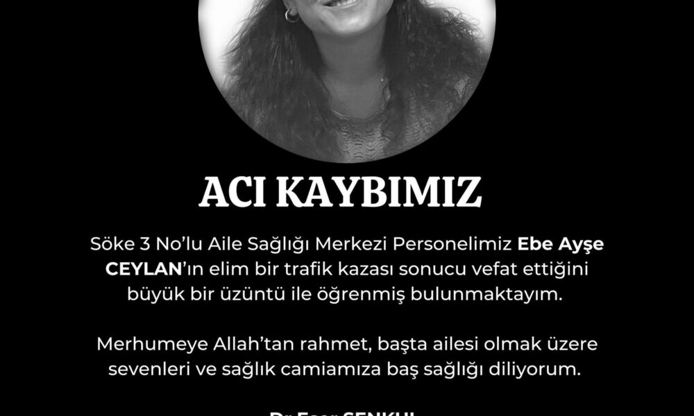 Aydın İl Sağlık Müdürü Dr. Eser Şenkul sosyal medya hesabından yaptığı açıklamada, “Söke 3 No’lu Aile Sağlığı Merkezi personelimiz Ebe Ayşe Ceylanın elim bir trafik kazası sonucu vefat ettiğini öğrenmiş bulunmaktayım. Merhumeye Allah’tan rahmet, başta ailesi olmak üzere sevenleri ve sağlık camiamıza başsağlığı diliyorum” ifadelerine yer verdi.