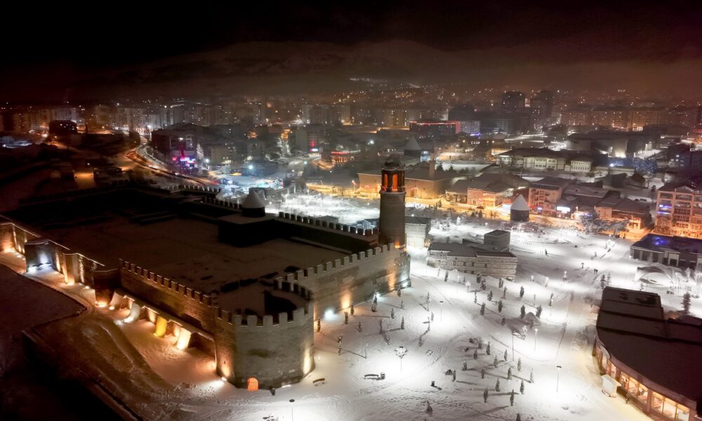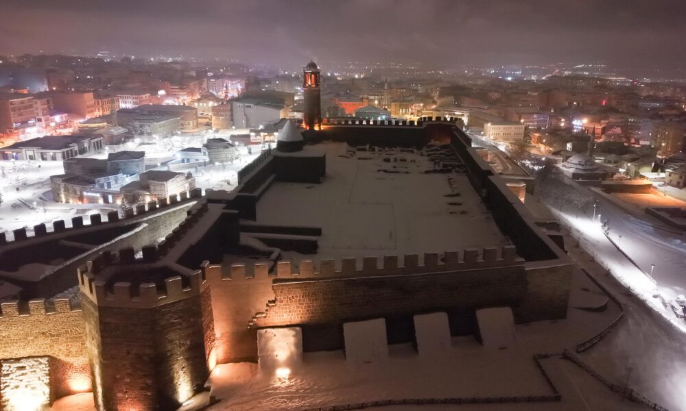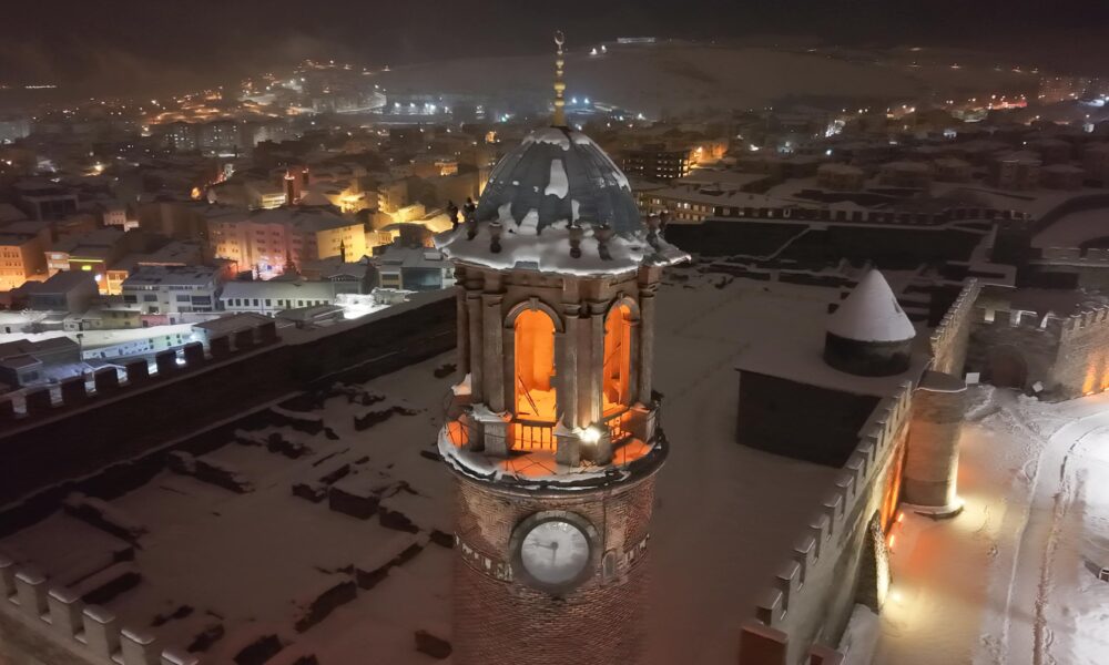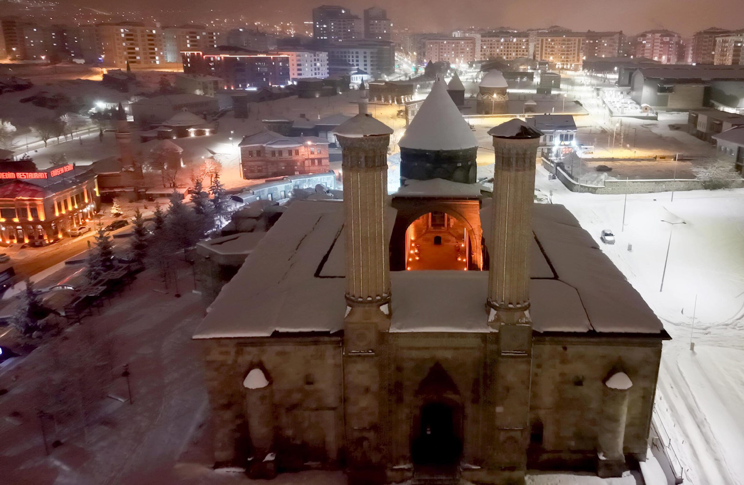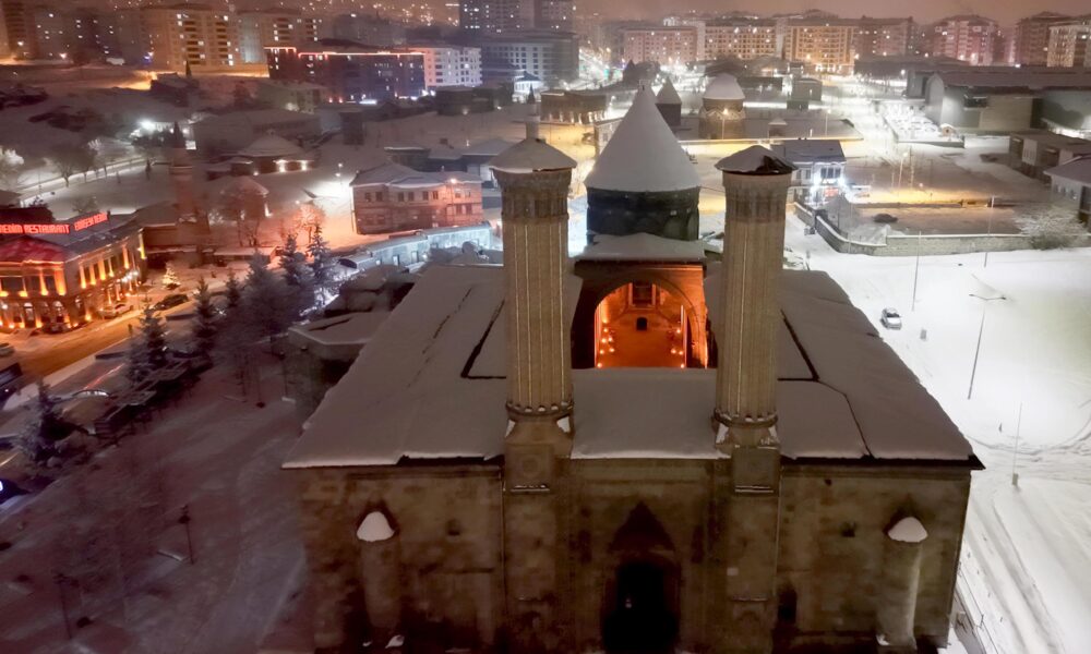 • Erzurum’da yoğun kar yağışının ardından, beyaz örtüyle kaplanan Çifte Minareli Medrese, Erzurum Kalesi ve Yakutiye Medresesi kartpostallık manzara oluşturdu. Fotoğraf: Oktay POLAT/Erzurum, (DHA)