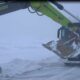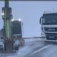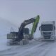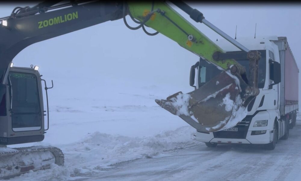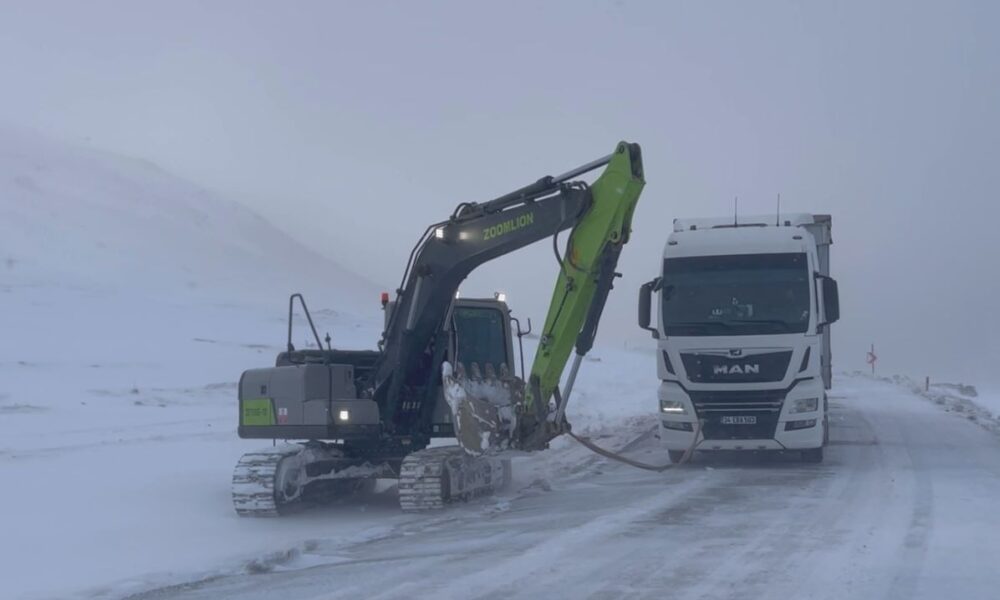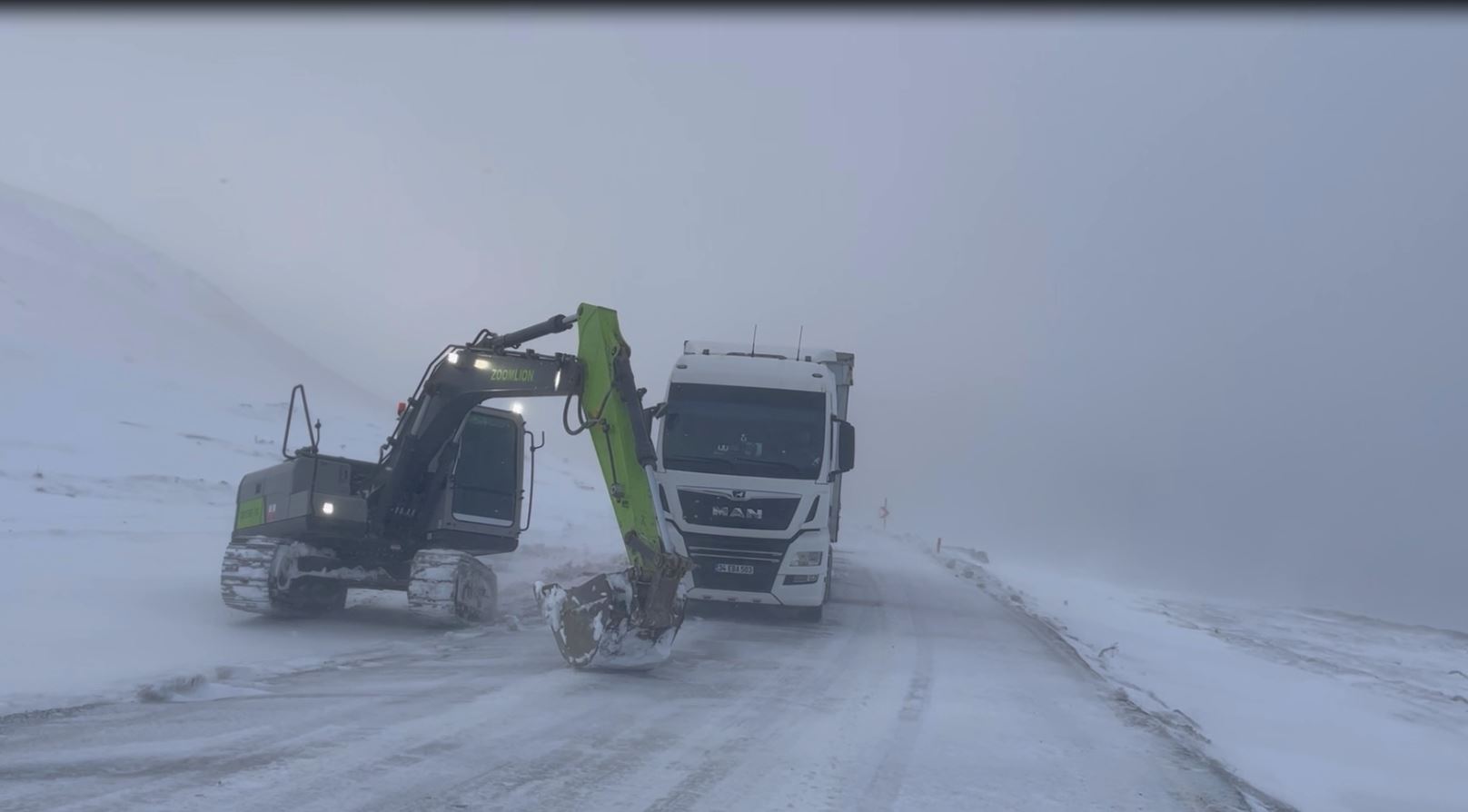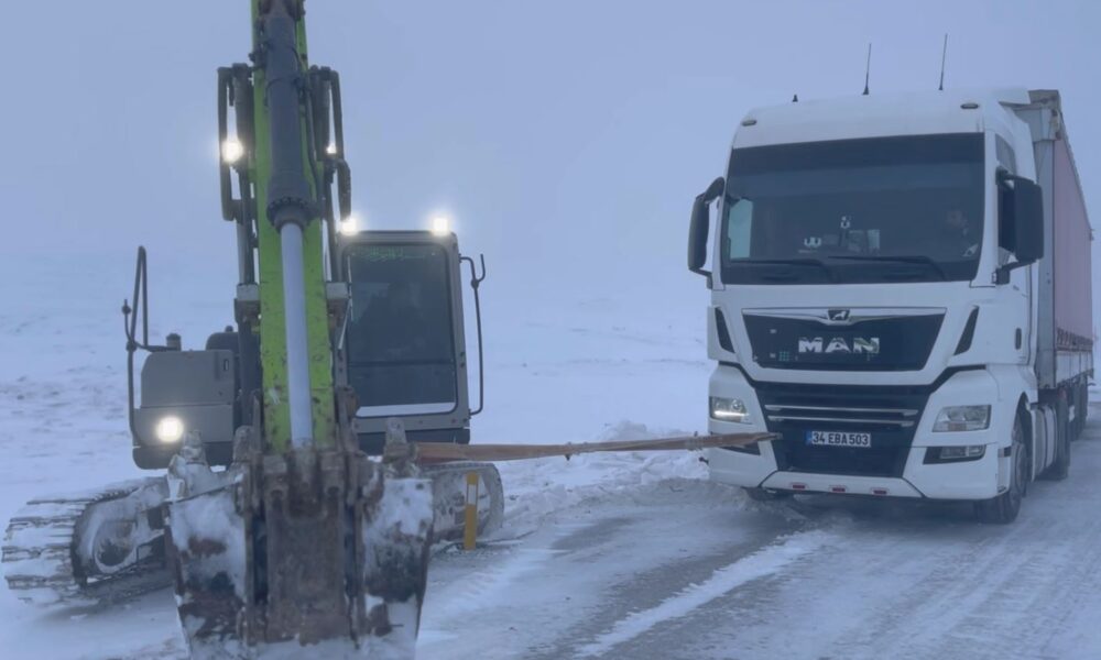 Kar nedeniyle yolda kalan TIR’a iş makineli kurtarma