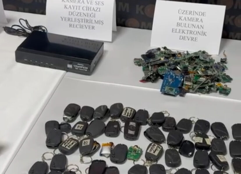 Şüphelinin evinde yapılan 2 ayrı aramada; kalem, priz, USB bellek, wi-fi adaptörü, masa saati, avize duyu, dijital saat, araba anahtarı, spot lamba gibi onlarca farklı objeye gizlenmiş kamera ve ses kayıt cihazlarının yanı sıra yüzlerce elektronik parça, kamera devreleri ve bataryalar bulundu.