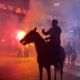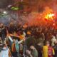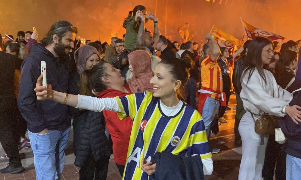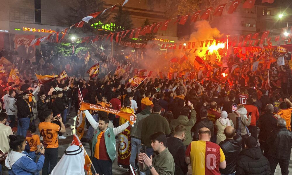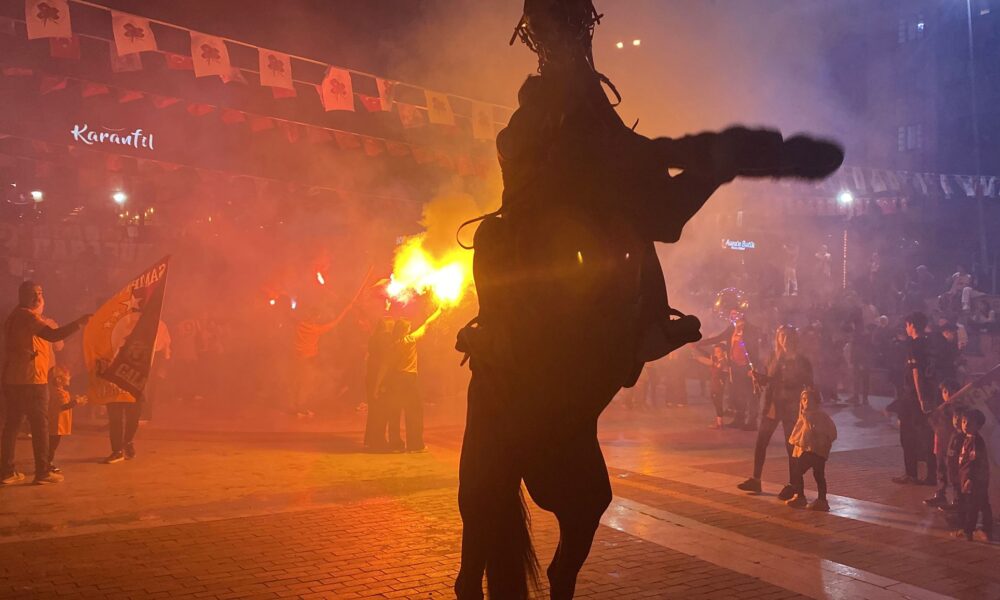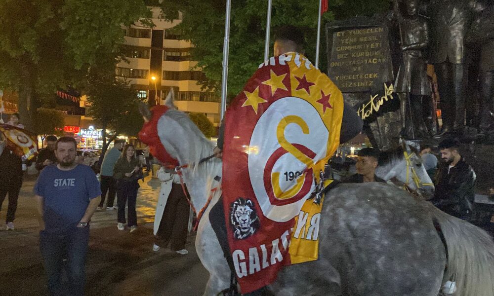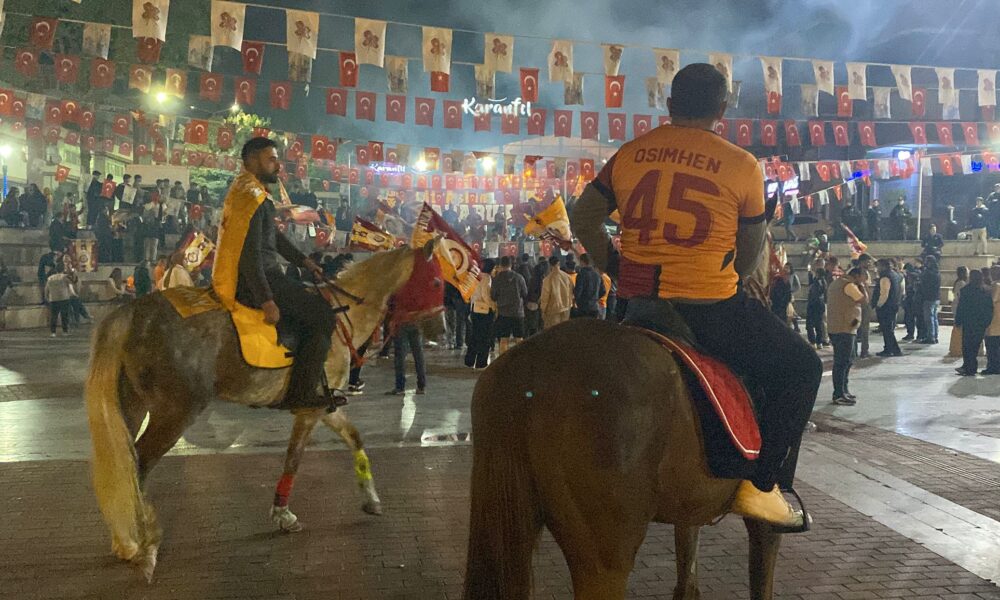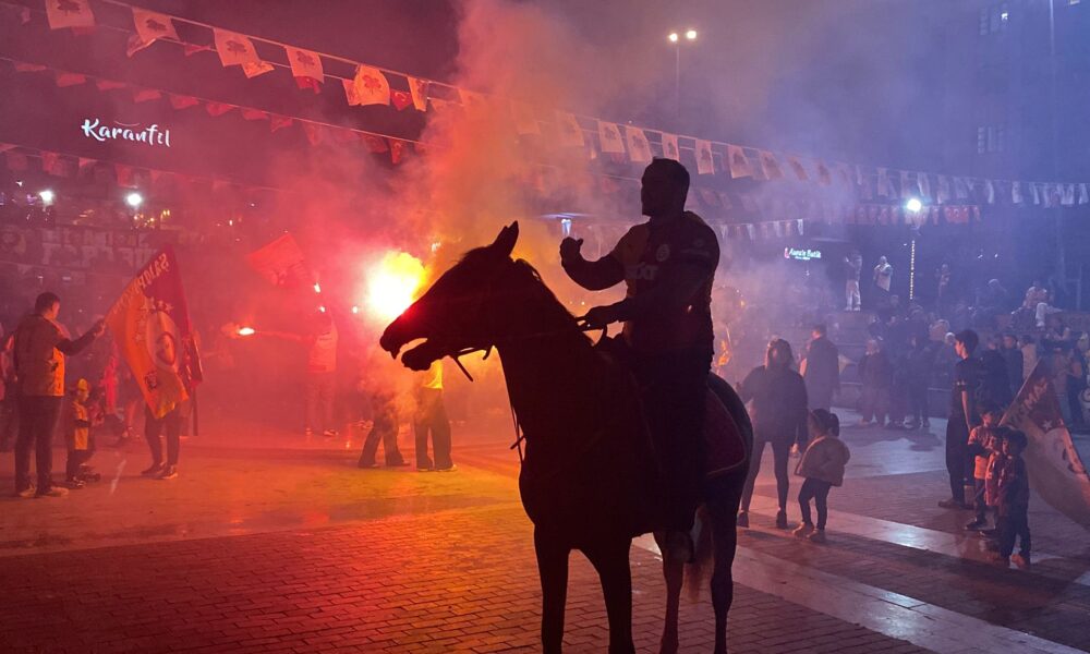 Süper Lig ekibi Galatasaray’ın şampiyonluğu garantilemesinin ardından sarı kırmızılı taraftarlar, Karabük’ün Safranbolu ilçesi Misak-ı Milli meydanına akın etti. Ellerinde Galatasaray bayrakları ve meşalelerle toplanan taraftarlar, takımlarının şampiyonluğunu tezahüratlar ve marşlarla kutladı. Kutlamalara Fenerbahçeli bir taraftar da katıldı. 3 arkadaş ise at binerek meydana geldi. Yasin Cihan arkadaşlarıyla at üstünde şampiyonluğu kutladı. Atlarını sarı kırmızı renklerle süsleyerek şampiyonluk kutlamalarına katılan Yasin Cihan, “Galatasaray’ın beşinci yıldızını kutlamak için Safranbolu’nun tarihi kentinde güzel bir etkinlik olsun dedik. Atlarımızla katıldık buraya. Bu coşkuyu hep beraber atlarımızla beraber sergiliyoruz” dedi.