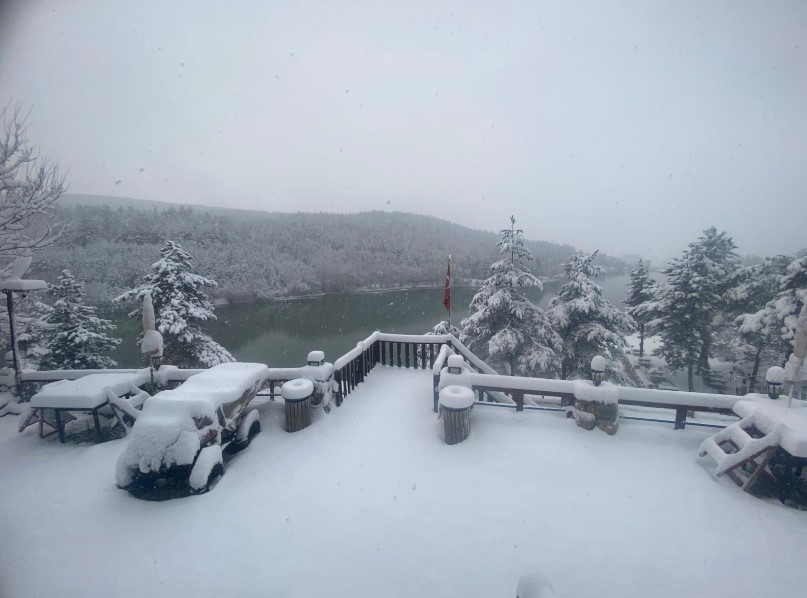 • Eflani Ortakçılar Göleti ve etrafındaki çam ağaçları ise etkili olan kar ile birlikte güzel görüntüler oluşturdu. Fotoğraf: Eflani,(DHA)