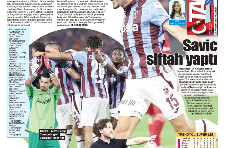 Antalyaspor karşısında Trabzonspor’a galibiyeti getiren golü stoper Stefan Savic kaydetti. Nisan 2021’den bu yana (Atletico Madrid formasıyla) ilk kez ligde gol sevinci yaşayan Savic, bordo-mavili formayla da siftah yaptı.